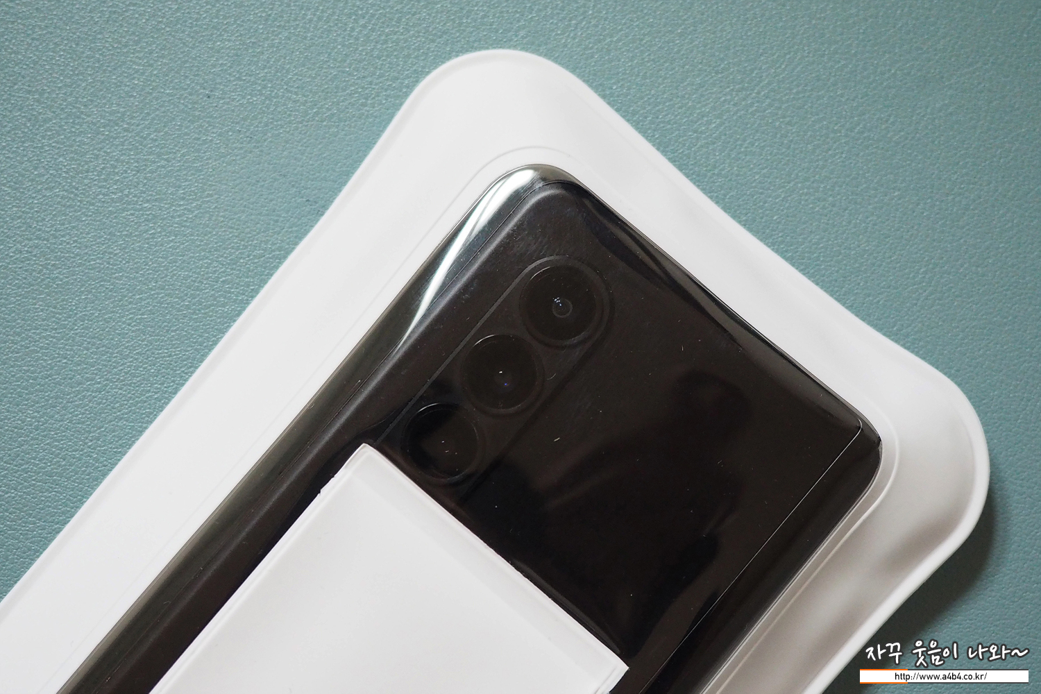 갤럭스 Z폴드 기준으로 스마트폰을 가장 아래로 내리면 사진과 같이 3개의 카메라는 모두 노출됩니다만, 아래에 위치한 플래쉬 부분은 암밴드 결합부위에 가려집니다. 플래쉬를 거의 사용하지 않아 저에게는 큰 문제가 없지만, 구매에 참고하세요.