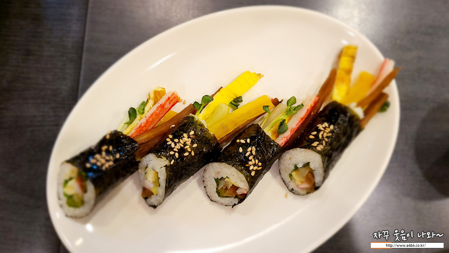 맛살, 우엉, 계란, 단무지, 무순이 들어간 꼬마 꼬투리 김밥입니다. 메밀국수 먹기 전이나 후에 입가심 하기에 좋은 한 입 쏙 들어가는 김밥입니다. 저는 일반 김밥도 꼬투리만 좋아해서 만족