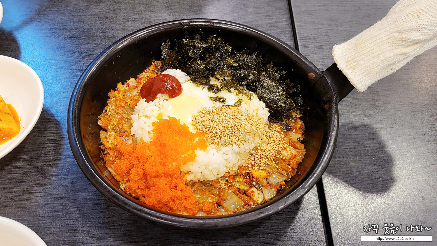 날치알과 잘개썬 김치, 통깨와 김가루에 마요네즈와 고추장, 마지막으로 계란이 들어간 김치볶음밥입니다. 조금 고소한 맛을 보여주는 김치볶음밥이네요. 김치볶음밥 잘 하는 분식집에서 맛볼수 있는 맛이라고 할까요?