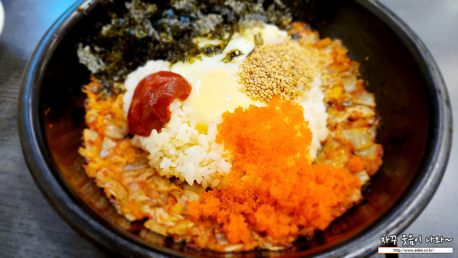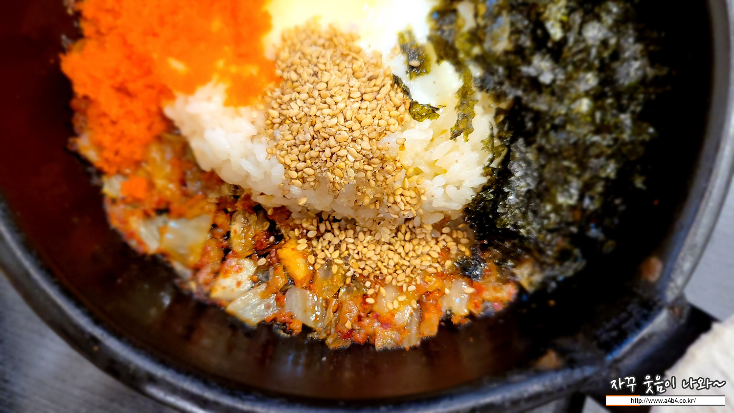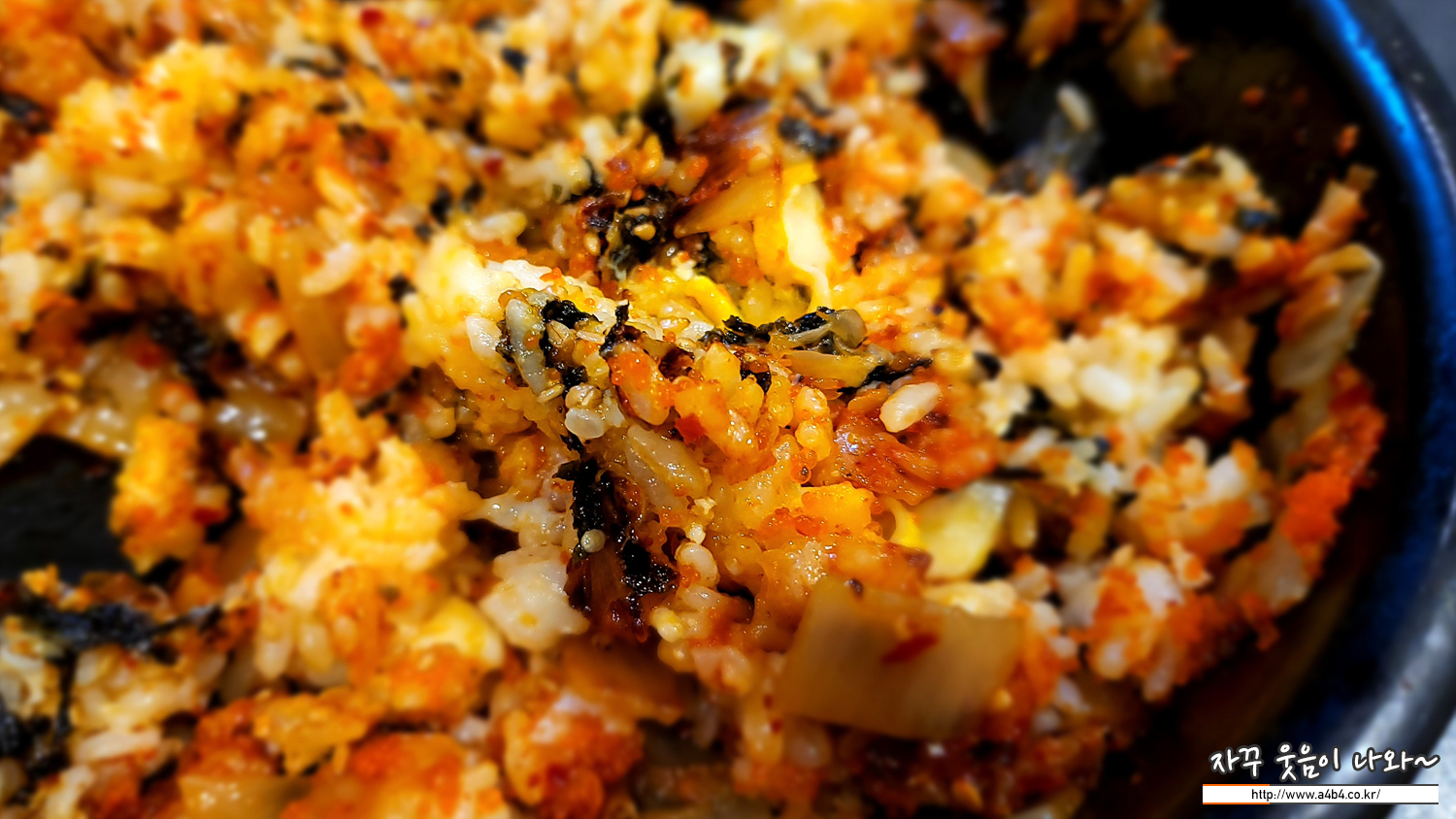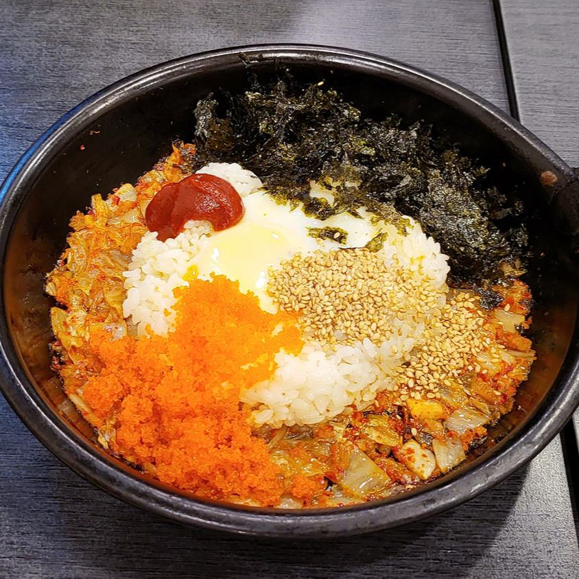 날치알과 잘개썬 김치, 통깨와 김가루에 마요네즈와 고추장, 마지막으로 계란이 들어간 김치볶음밥입니다. 조금 고소한 맛을 보여주는 김치볶음밥이네요. 김치볶음밥 잘 하는 분식집에서 맛볼수 있는 맛이라고 할까요?