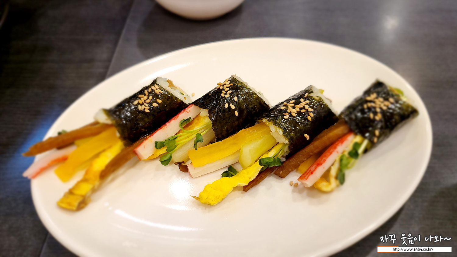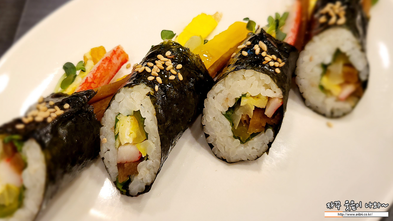 맛살, 우엉, 계란, 단무지, 무순이 들어간 꼬마 꼬투리 김밥입니다. 메밀국수 먹기 전이나 후에 입가심 하기에 좋은 한 입 쏙 들어가는 김밥입니다. 저는 일반 김밥도 꼬투리만 좋아해서 만족