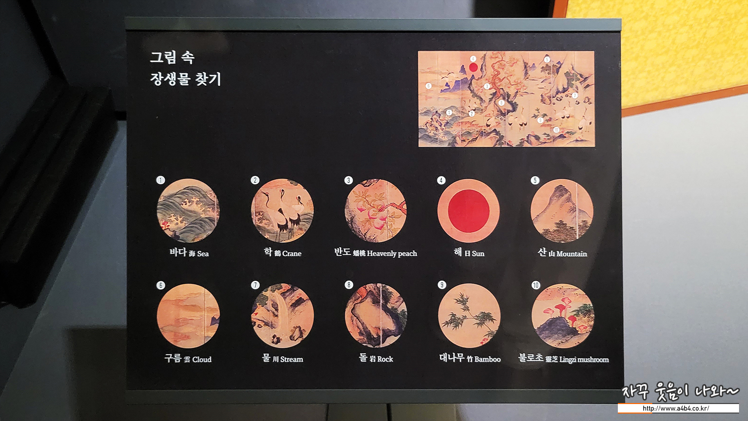 자연은 늘 변화하지만 짧은 시간을 살다 가는 인간의 눈에는 영원한 것처럼 보이기도 합니다. 이 병풍은 바닷가 절벽에서 자라난 복숭아와 학 무리를 그린 것으로 십장생도에서 파생된 장식 그림입니다. 반도蟠桃는 삼천 년에 한번 열매를 맺으며, 한 알을 먹으면 수명이 삼천 년 늘어난다고 하는 복숭아입니다. 해가 떠올라 불그스름하게 물든 대기 속에 신선의 세계처럼 환상적인 경치가 펼쳐져 있습니다.
