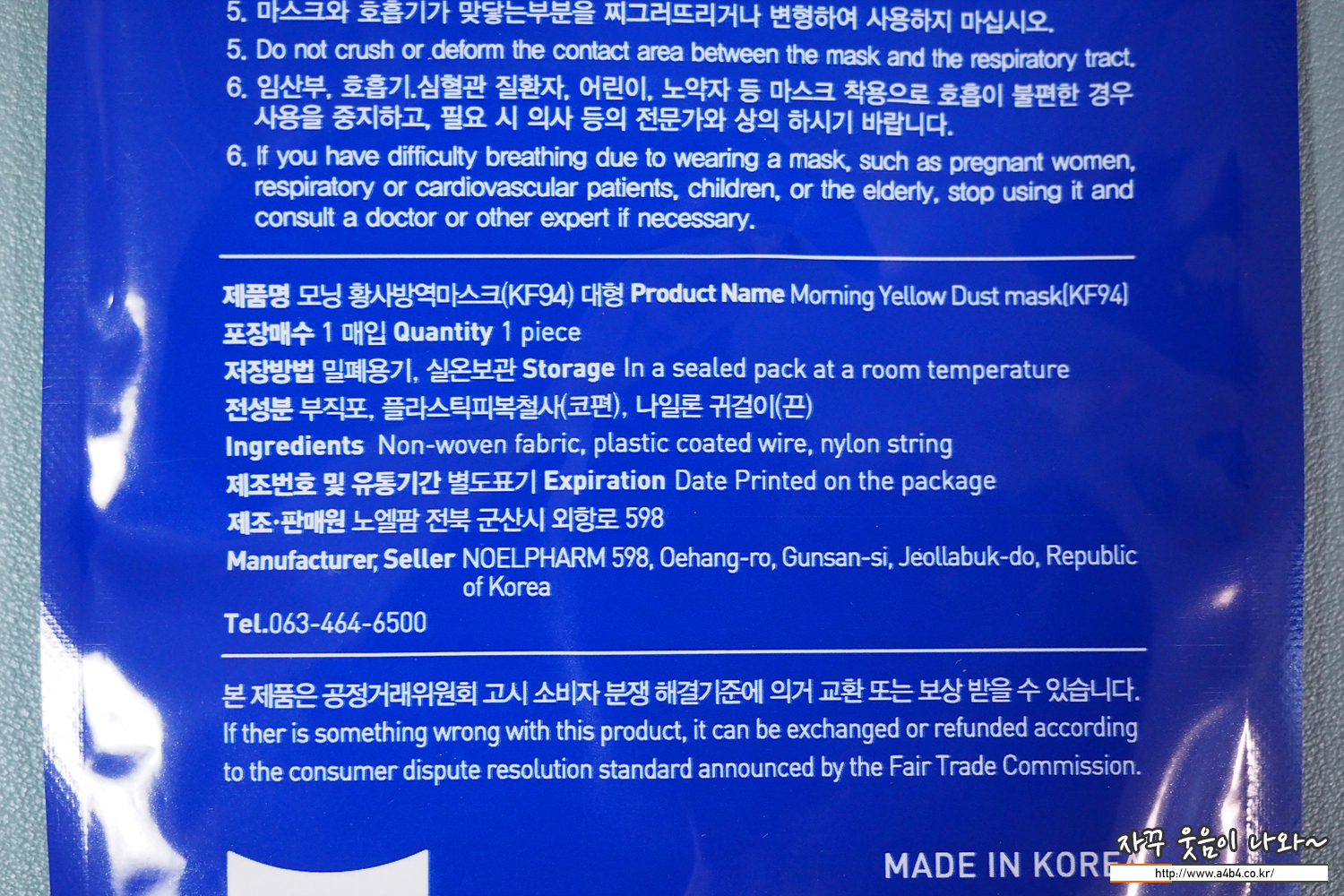 모닝황사방역 마스크의 제조원은 노엘팜으로 오라클 마스크 제조원인 아태가연과 다르네요.