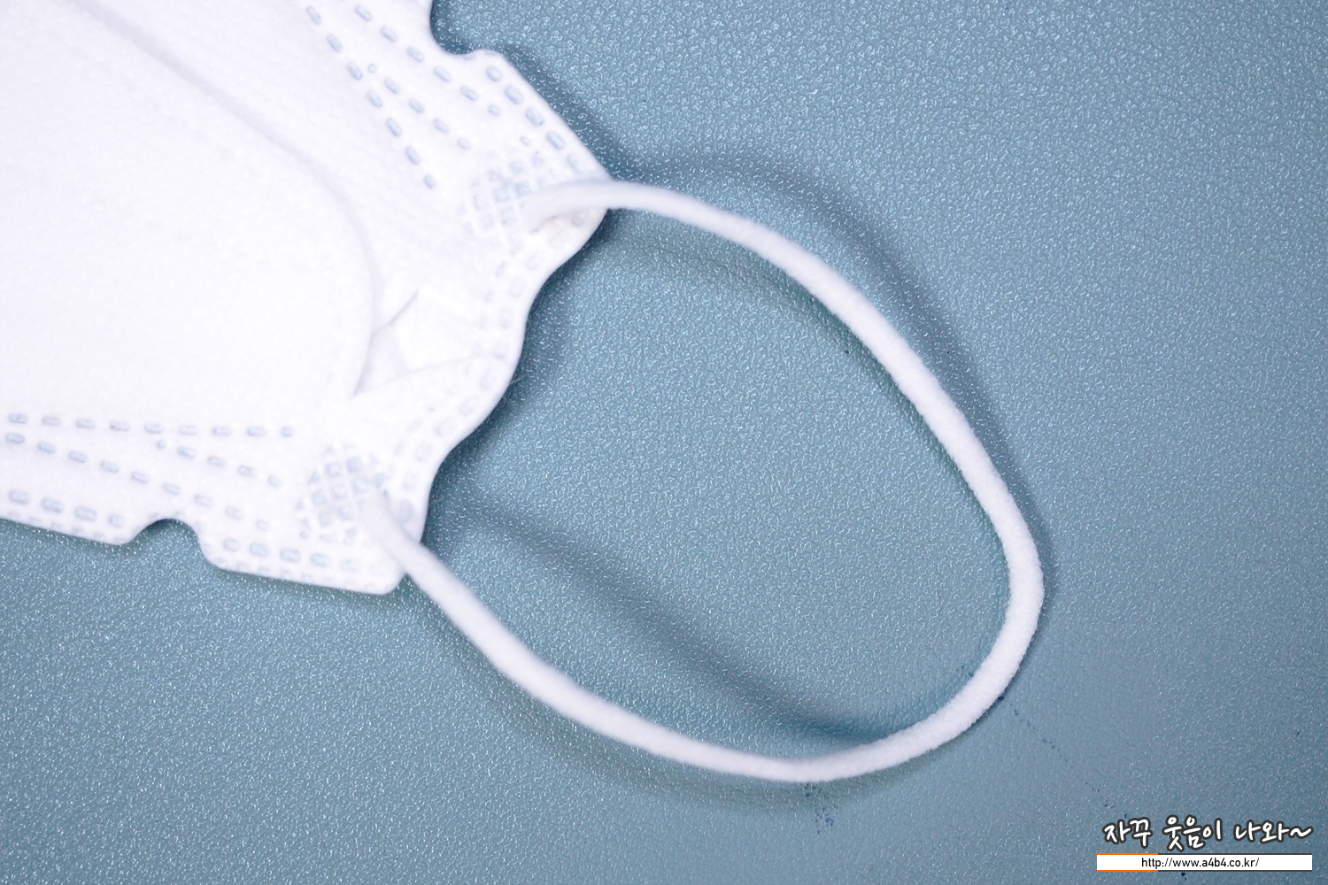 마스크 뒷부분에 둥근 모양의 폴리우레탄/나일론끈이 부착되어 있습니다.부착 상태는 양호하며, 귀걸이끈 탄성은 조금 강한 타입의 제품입니다.