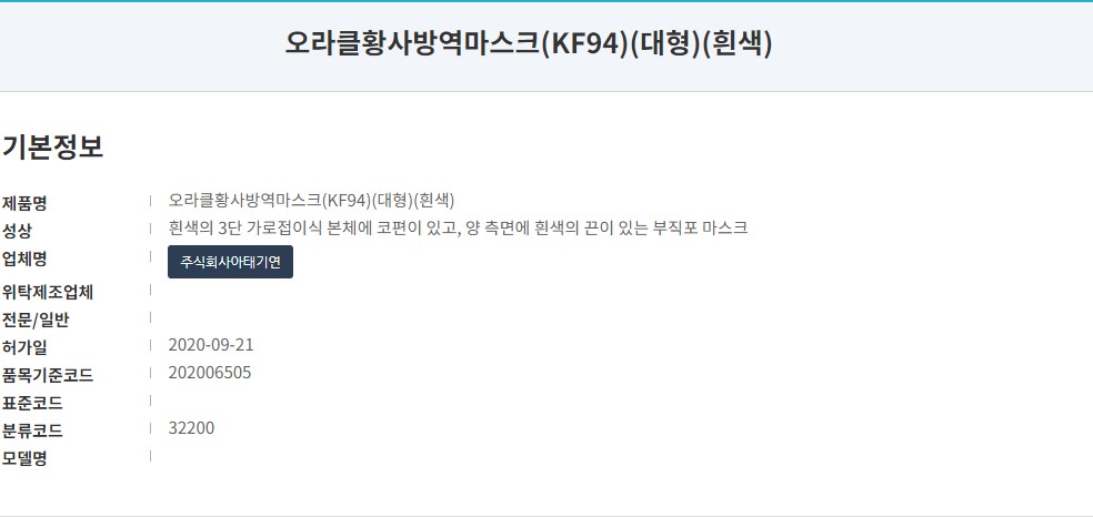 식품의약품안전처 의약품안전나라에 등록된 제품명은 '오라클황사방역마스크'입니다. KF94 타입으로 사이즈는 대형, 컬러는 흰색의 제품입니다. 마스크 제조사는 '주식회사 아태기연'으로 2020년 09월 21일 허가된 마스크입니다.