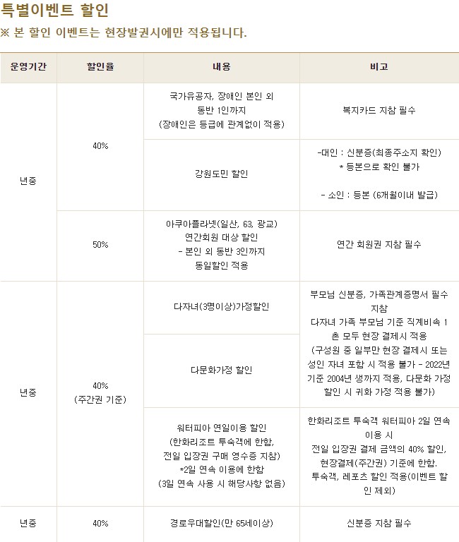 | 한화 설악 워터피아 할인카드 및 할인율 (클릭하면 커짐)