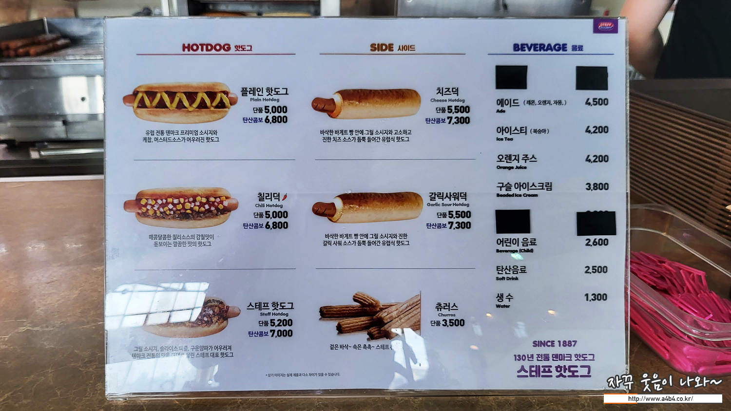 워터파크 이용 중간에 허기를 달래기 위해 핫도그 한 개 먹습니다. 스테프 핫도그가 입점해 있습니다.