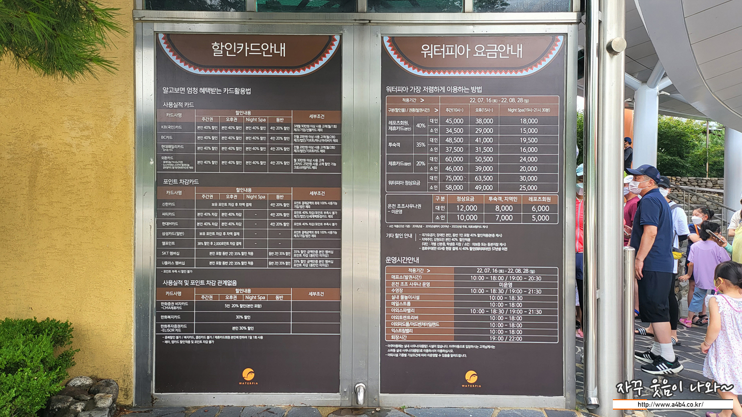 이곳 워터피아 정상요금은 7만 5천원입니다. 물론 해당 정가를 모두 지불하고 이용하는 분들은 없겠지만, 조건에 따라 15%에서 최대 50% 할인된 요금으로 입장이 가능합니다.