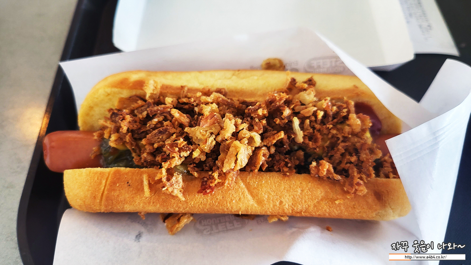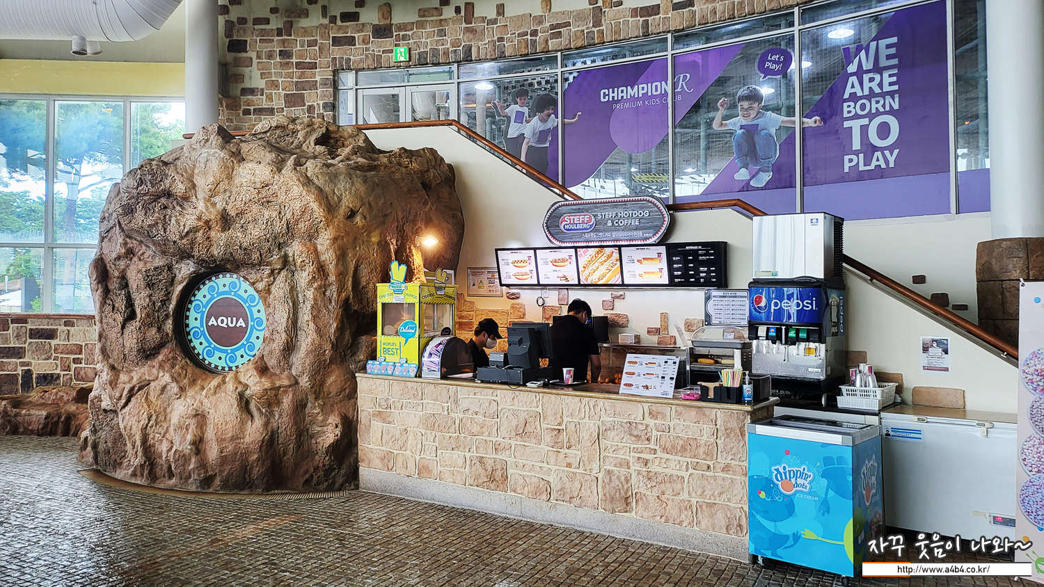 워터파크 이용 중간에 허기를 달래기 위해 핫도그 한 개 먹습니다. 스테프 핫도그가 입점해 있습니다.
