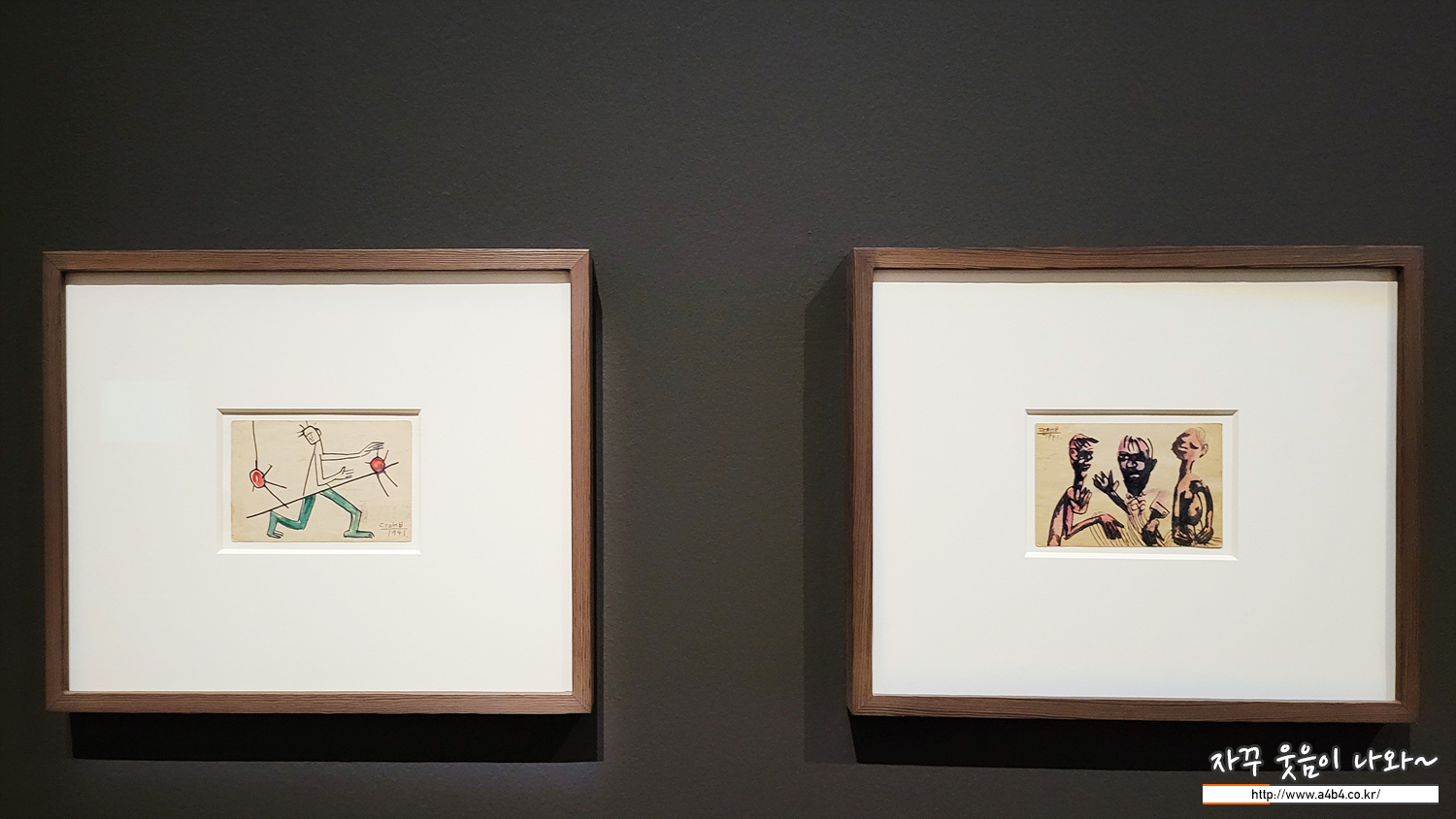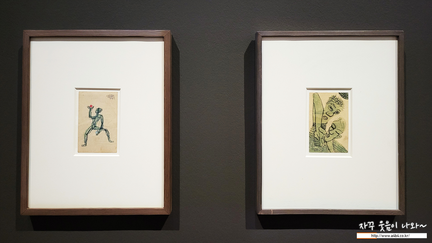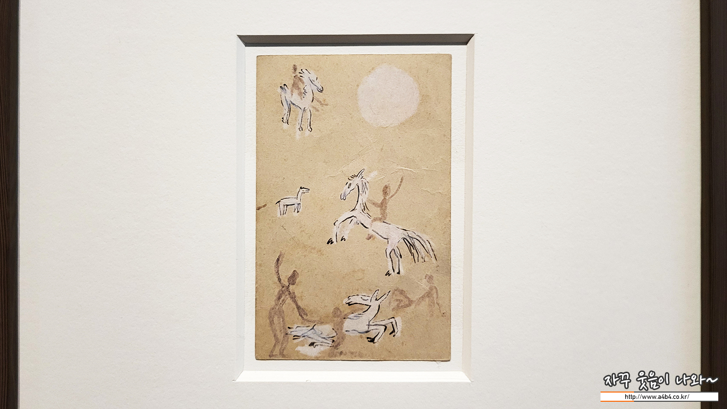 덕분에 마치 돌에 음각으로 새겨진 듯한 느낌을 받게 하죠. 원색이 조금 더 드러나는 오른쪽 작품은, 1954년 일본에 있던 큰아들 태현에게 보낸 편지에 그려져 있던 그림입니다.
