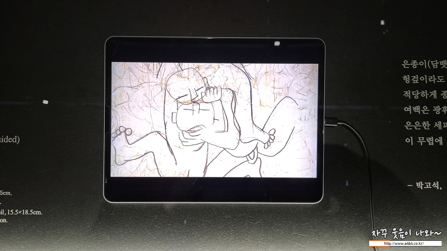 은지화의 경우 작품의 손상을 방지하기 위해 다소 어두운 공간에서 전시되고 있습니다. 또한 화학한응 등으로 작품 오염시 생기기도 했는데요. 확대된 영상을 통해 작은 작품을 디테일하게 감상할 수 있는 공간도 마련되어 있습니다.