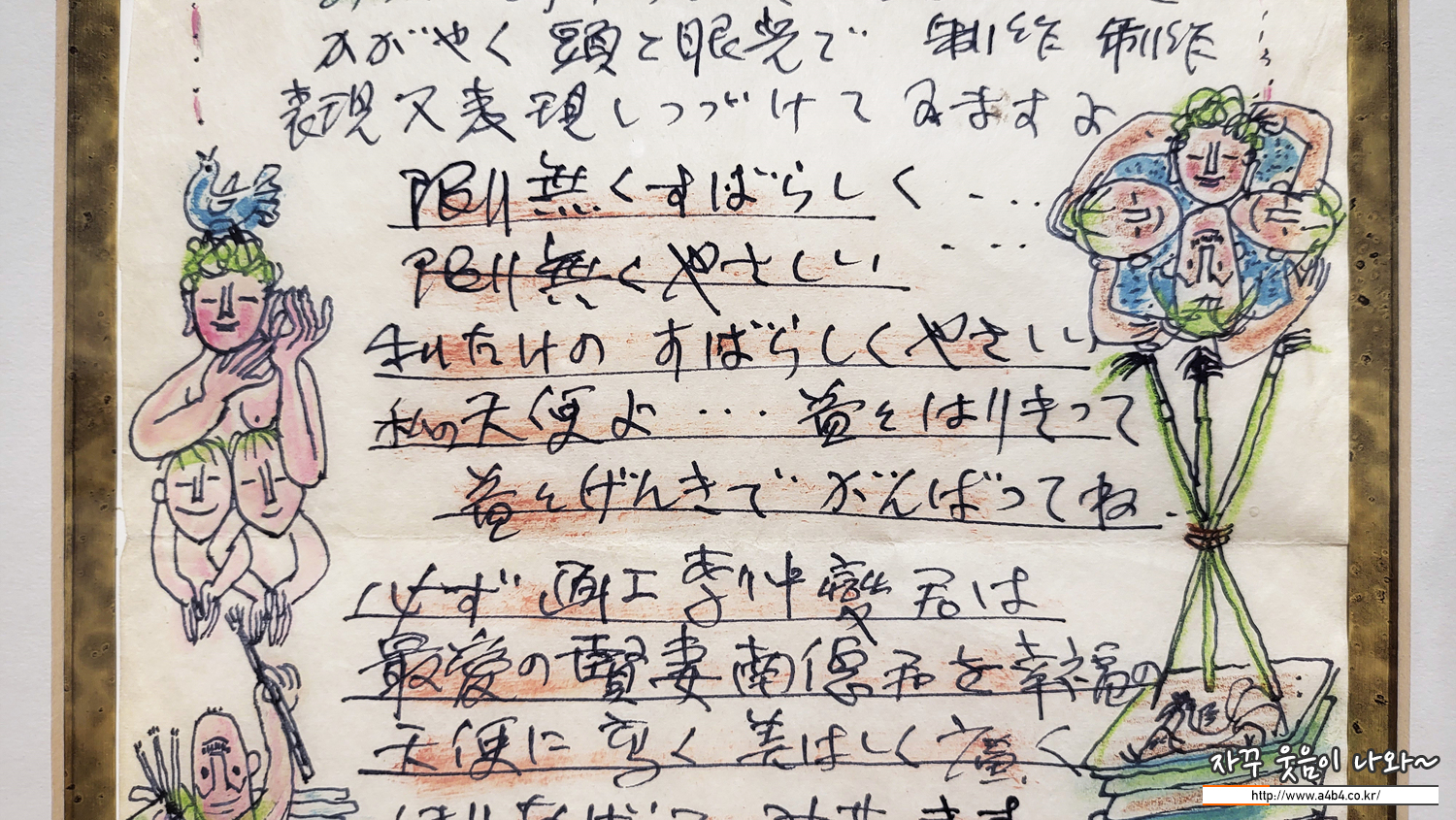 마치 연애편지라도 쓰듯, 몇 번이나 찢어버리면서 다시 쓰고 그림을 꼭 곁들였으며, 봉투를 쓸 때는 굵직한 펜으로 마음에 들 때까지 몇 장이고 글씨를 반복해서 다듬었다고요. 현재 남아 있는 38통의 편지 가운데, 1954년 11월경에 보낸 이 편지는