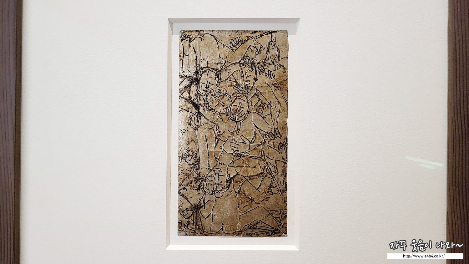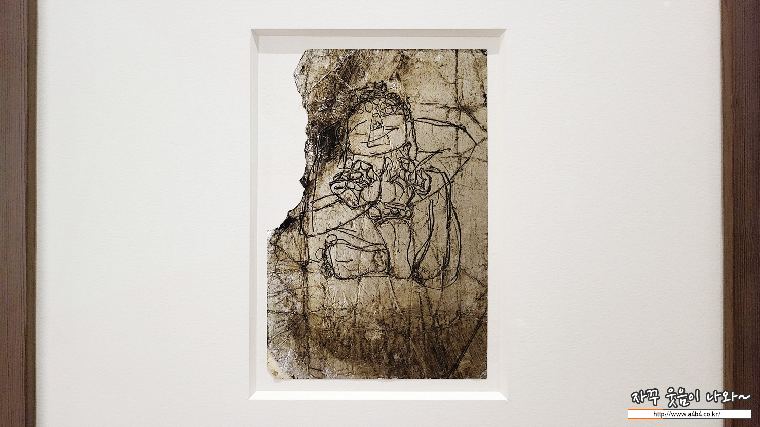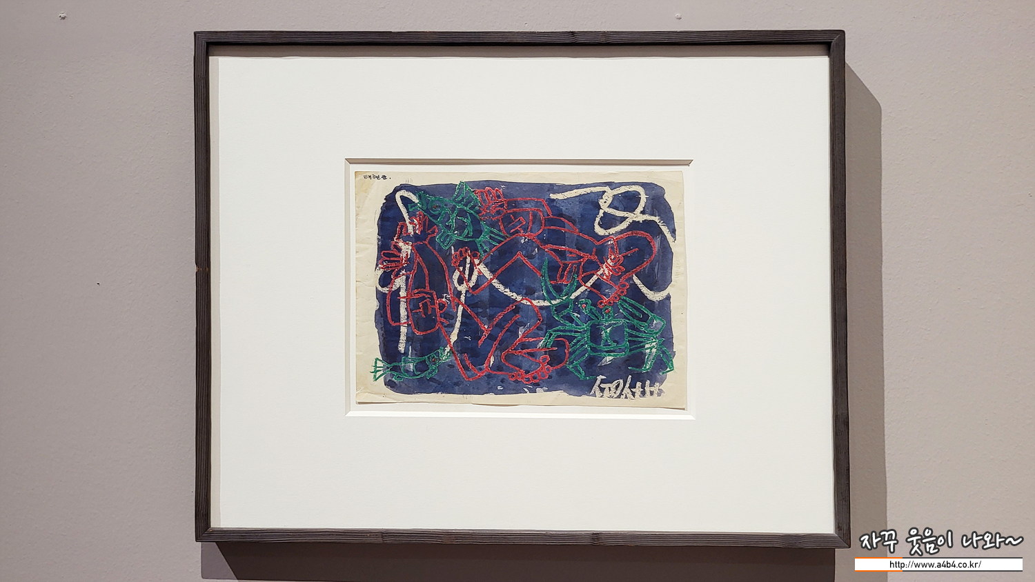 덕분에 마치 돌에 음각으로 새겨진 듯한 느낌을 받게 하죠. 원색이 조금 더 드러나는 오른쪽 작품은, 1954년 일본에 있던 큰아들 태현에게 보낸 편지에 그려져 있던 그림입니다.