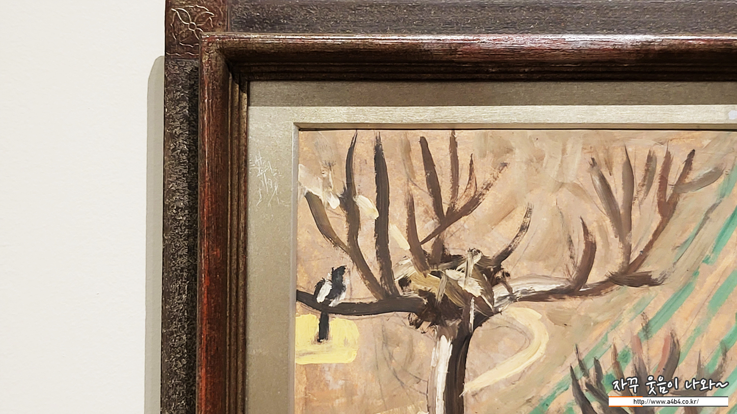현재 남아 있는 9점 가운데 하나인 ‹나무와 까치가 있는 풍경›은 제목처럼, 나무 위에 까치가 앉아 있는 모습을 그리고 있는데요, 화면 전면에 자리 잡은 나무의 가지에는 잎이 달려 있지 않습니다. 그래서 언뜻 보면 겨울의 풍경을 그린 듯하지만,