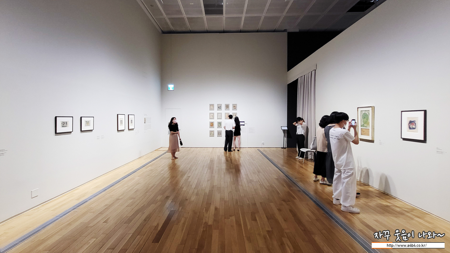 이번 전시회 또한 한 시간 단위로 예약자대상 입장이 진행되는데요. 바로 앞에서 입장하기 보다는 입장시간 조금 지나 입장하시면 좀 더 편한하게 관람이 가능합니다. 아래 사진 왼쪽은 정각에 입장한 공간, 오른쪽은 입장후 30분 후에 다시온 공간입니다. 이 시간부터 관람하시면 쾌적하게 이중섭 전시회 관람이 가능합니다.