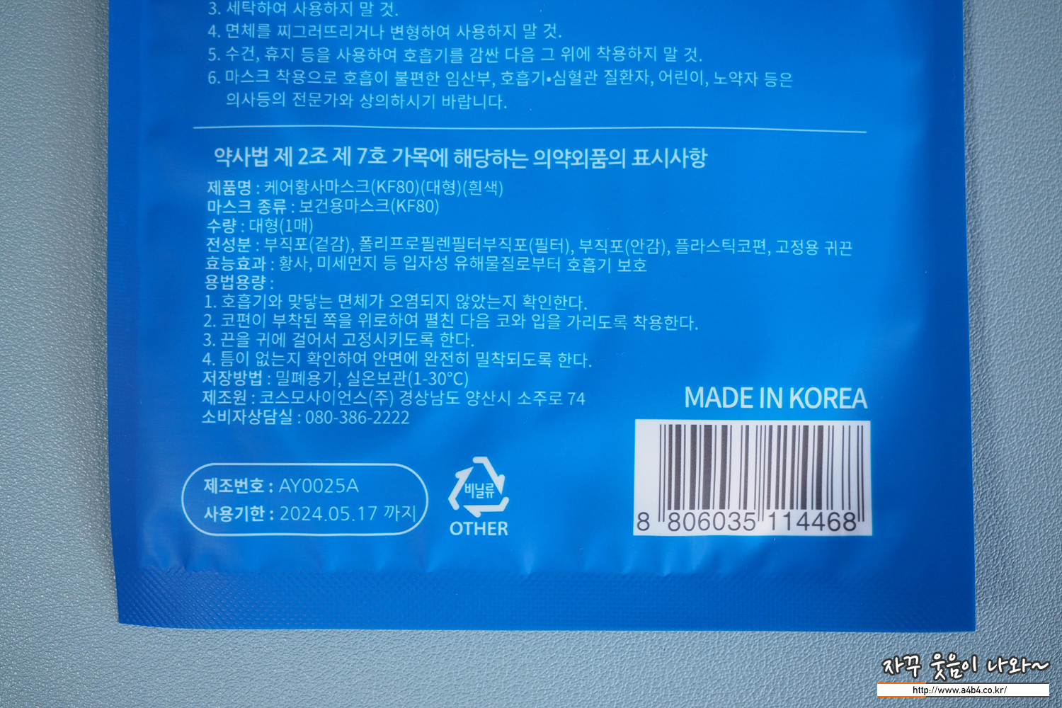식약처 의약품안전나라에 등록된 제품명은 '케어황사마스크'입니다. KF80타입으로 사이즈는 대형, 중형, 소형, 색상은 흰색, 검은색이 있습니다. 2021년 1월 29일 승인된 제품으로 마스크 제조사은 코스모사이언스 주식회사입니다. 마스크 이외에도 다양한 의약외품을 셍산하는 곳입니다.