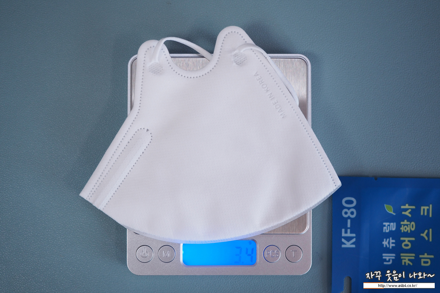 KF80 네츄럴케어 황사마스크 대형 무게는 3.4그램으로 다른 대형사이즈 새부리형 마스크에 비해 가벼운 무게를 보입니다.
