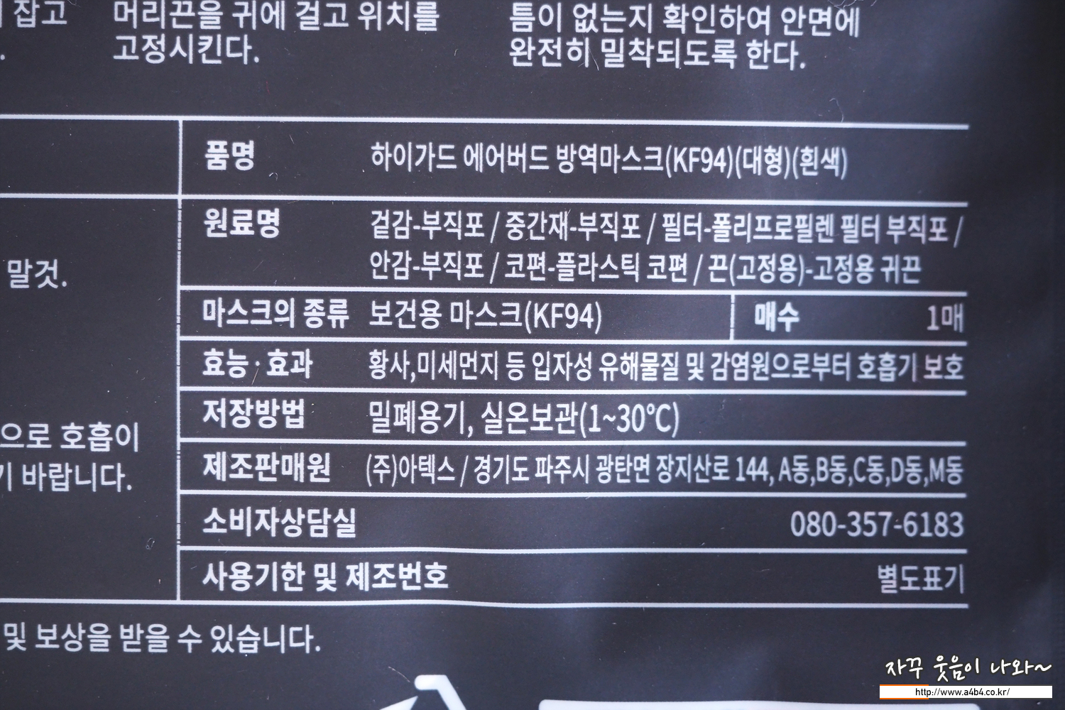 마스크 제조사는 '(주)아텍스(Atex.co.,Ltd)'로 2021년 05월 18일 허가된 마스크입니다. 아텍스는 하이가드 브랜드로 입체형 마스크나 팽수 마스크, 대박이 마스크 등을 판매하는 곳이기도 합니다.