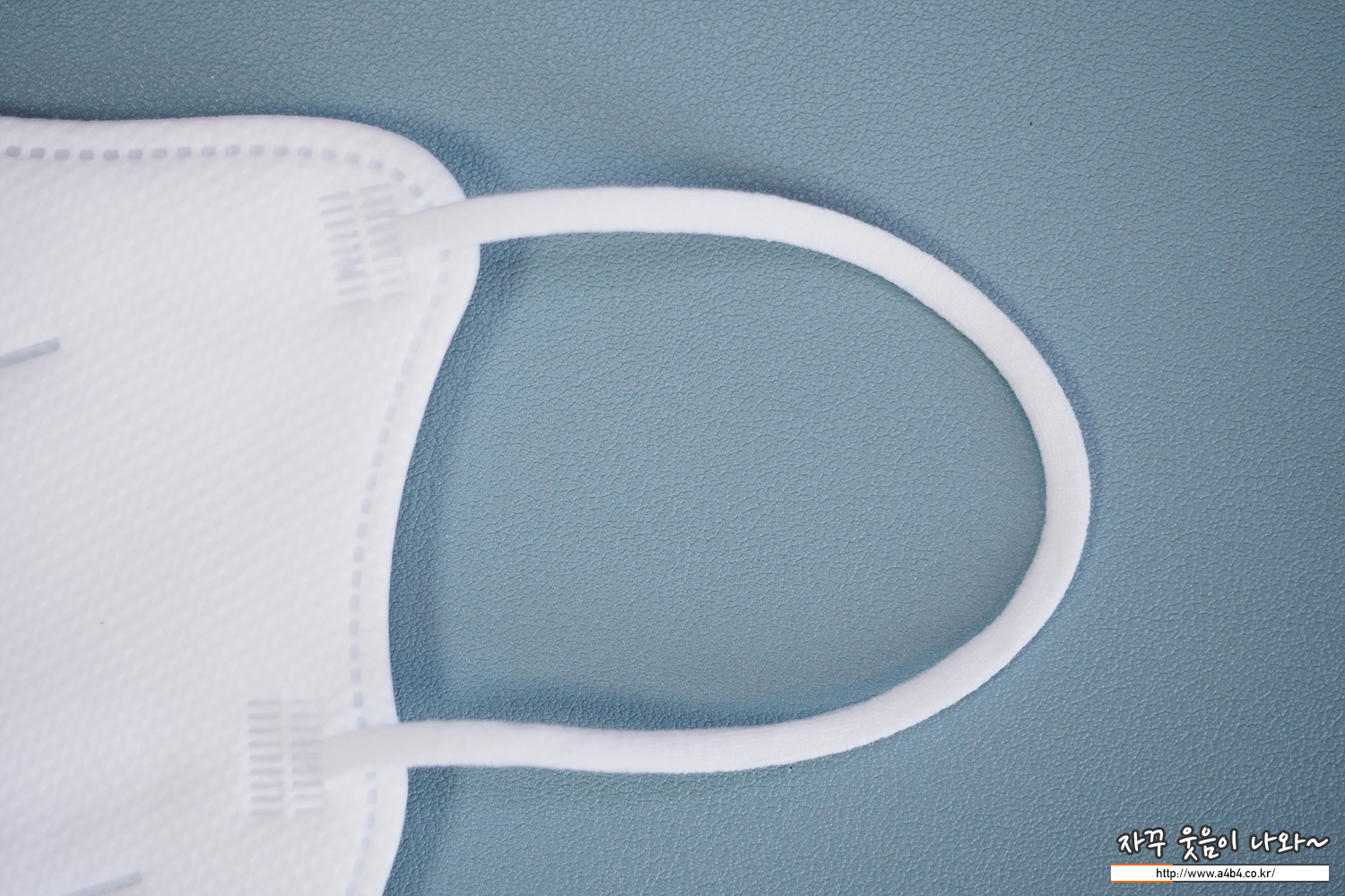 마스크 전면에 부착된 납작한 타입의 칼국수 이어밴드 마감은 깔끔하게 잘 처리되었으며, 이어밴드 탄성은 일반적인 수준을 보입니다.