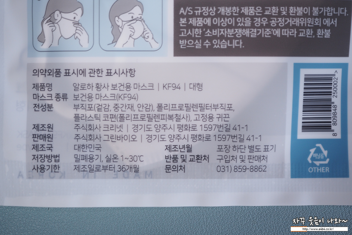 무엇보다도 마스크에 사용된 원자재가 100% 국내산이 사용된 부분이 매력입니다.