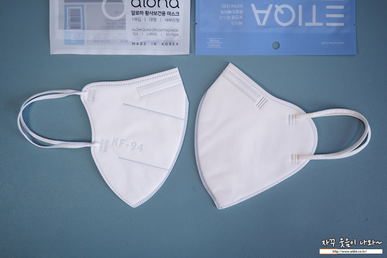 알로하황사보건용마스크 디자인은 일반적인 가로 2단접이식 새부리형 마스크 디자인을 보입니다. 마스크 전면에는 마스크 필터타입인 KF-94가 각인되어 있으며, 상당히 많은 제조사에서 사용하는 보편적인 디자인의 제품입니다.