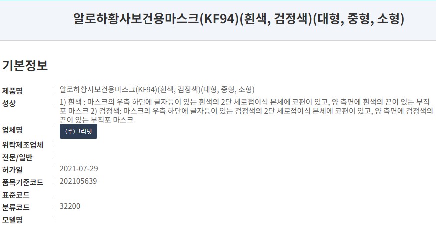 2021년 07월 29일 승인된 마스크로 제조사는 '주식회사 크리넷' 판매원은 그린바이오 입니다.