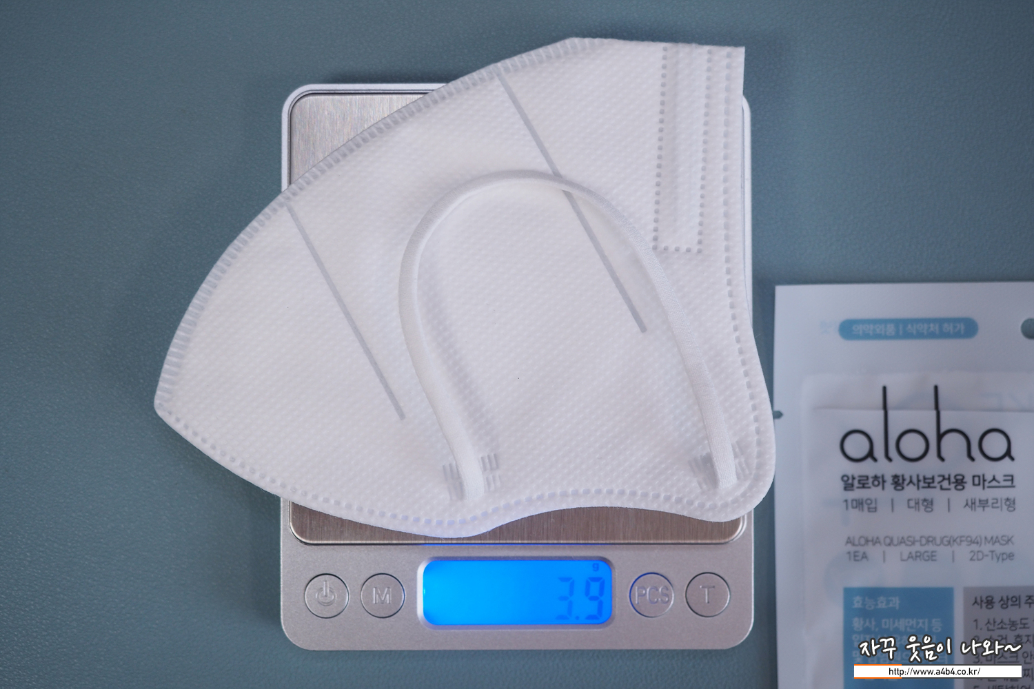 KF94 알로하황사보건용마스크 대형 흰색 무게는 3.9g으로 대형 사이즈 제품 중에서는 약간 가벼운 무게를 보입니다.