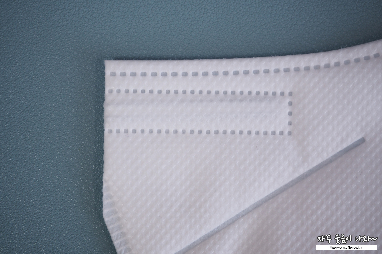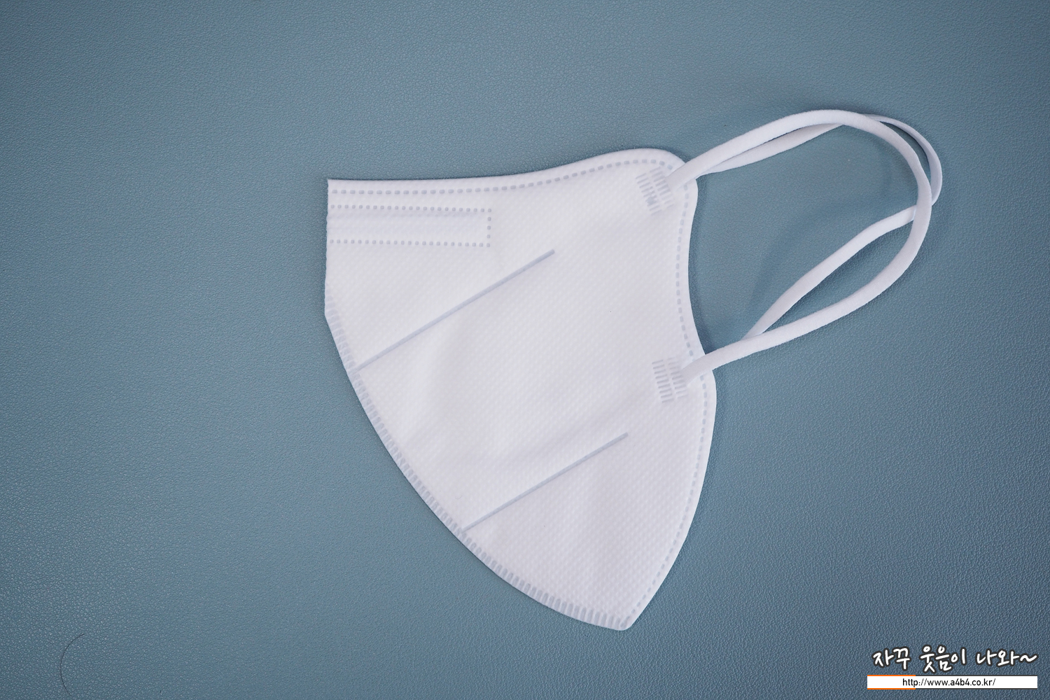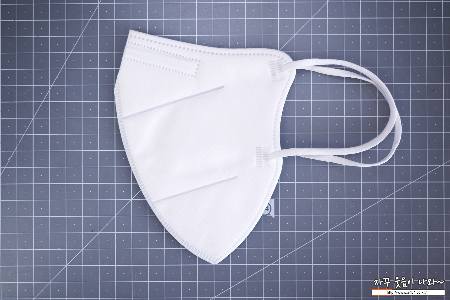마스크 전면에 부착된 납작한 타입의 칼국수 이어밴드 마감은 깔끔하게 잘 처리되었으며, 이어밴드 탄성은 일반적인 수준을 보입니다.