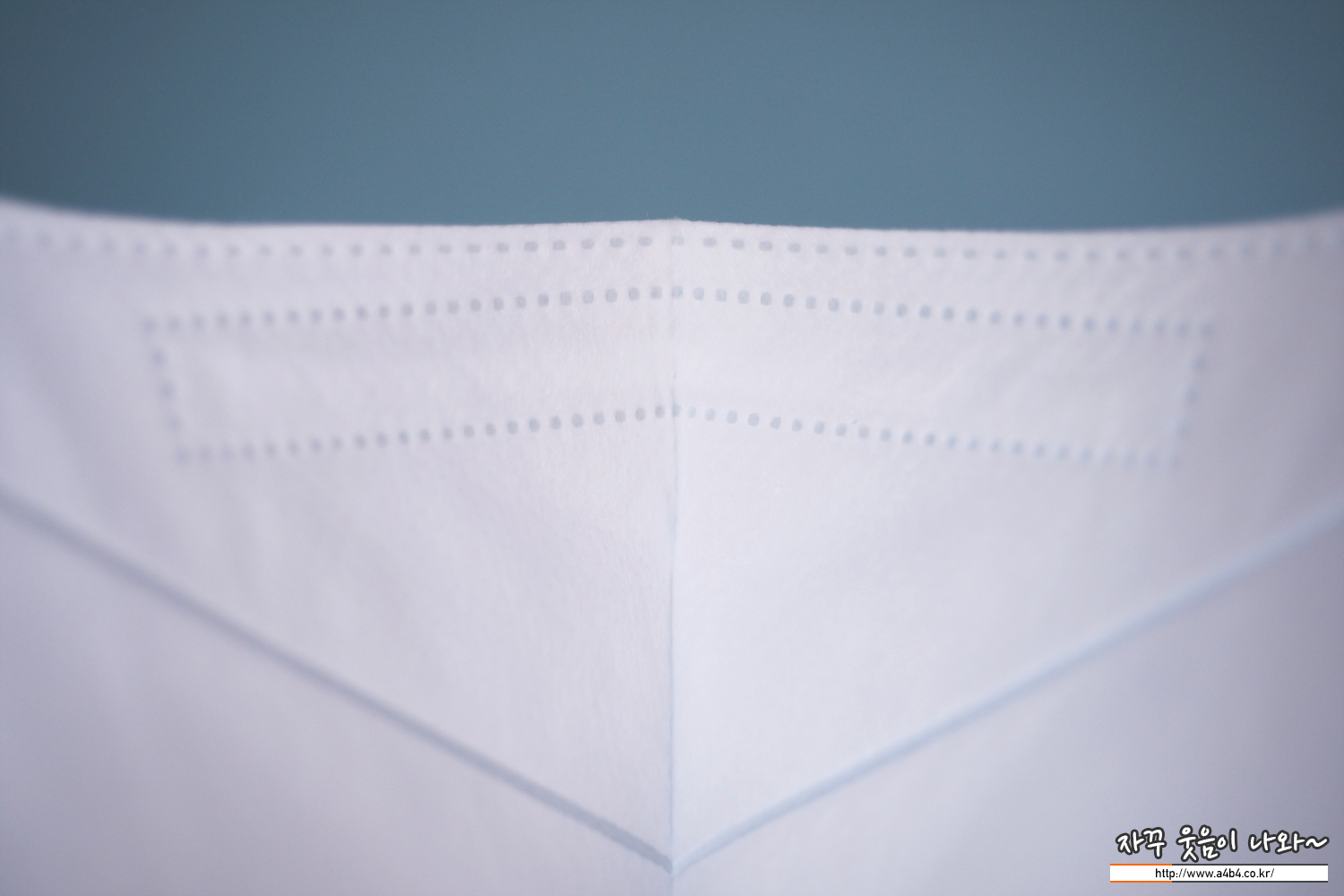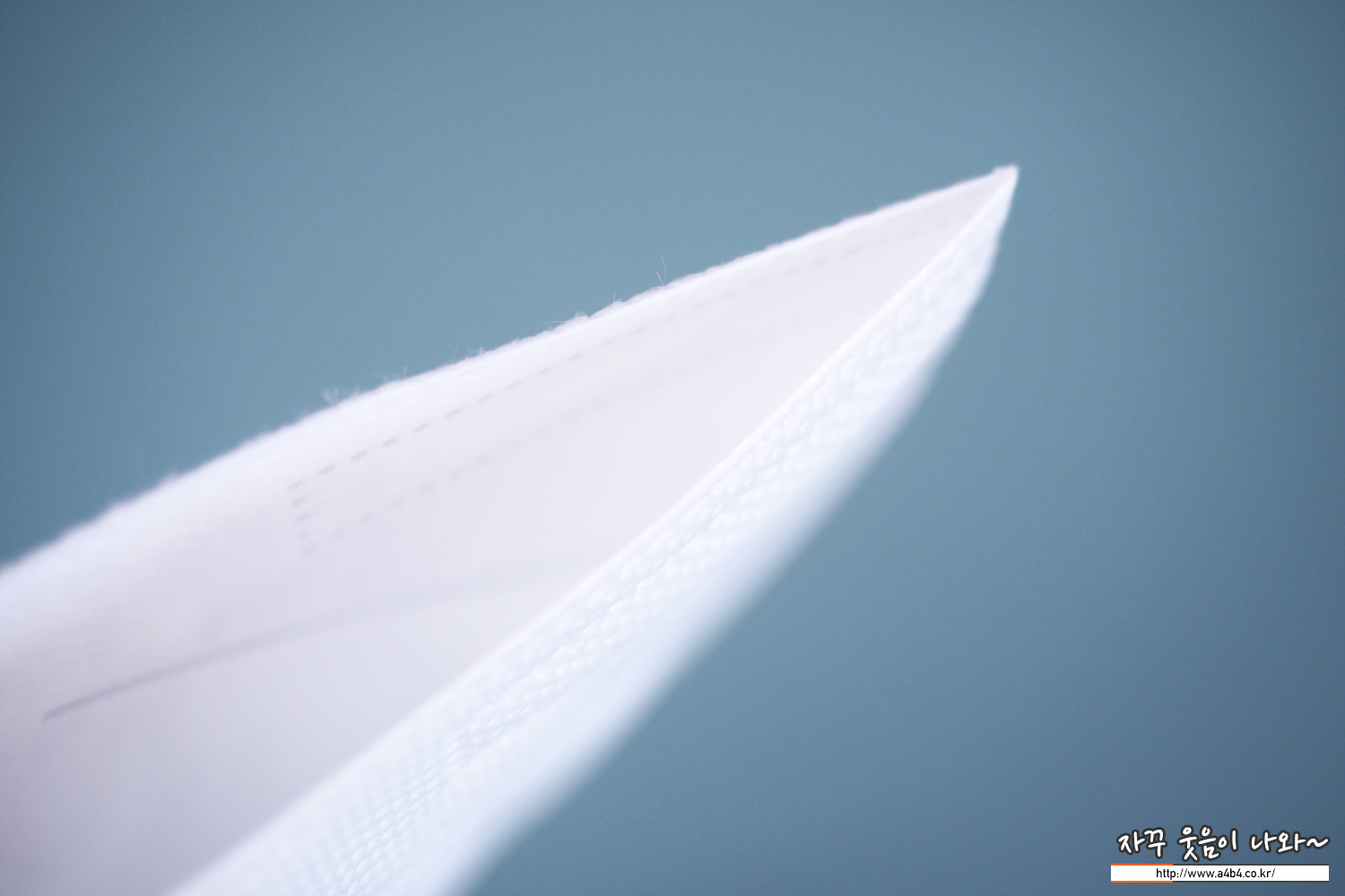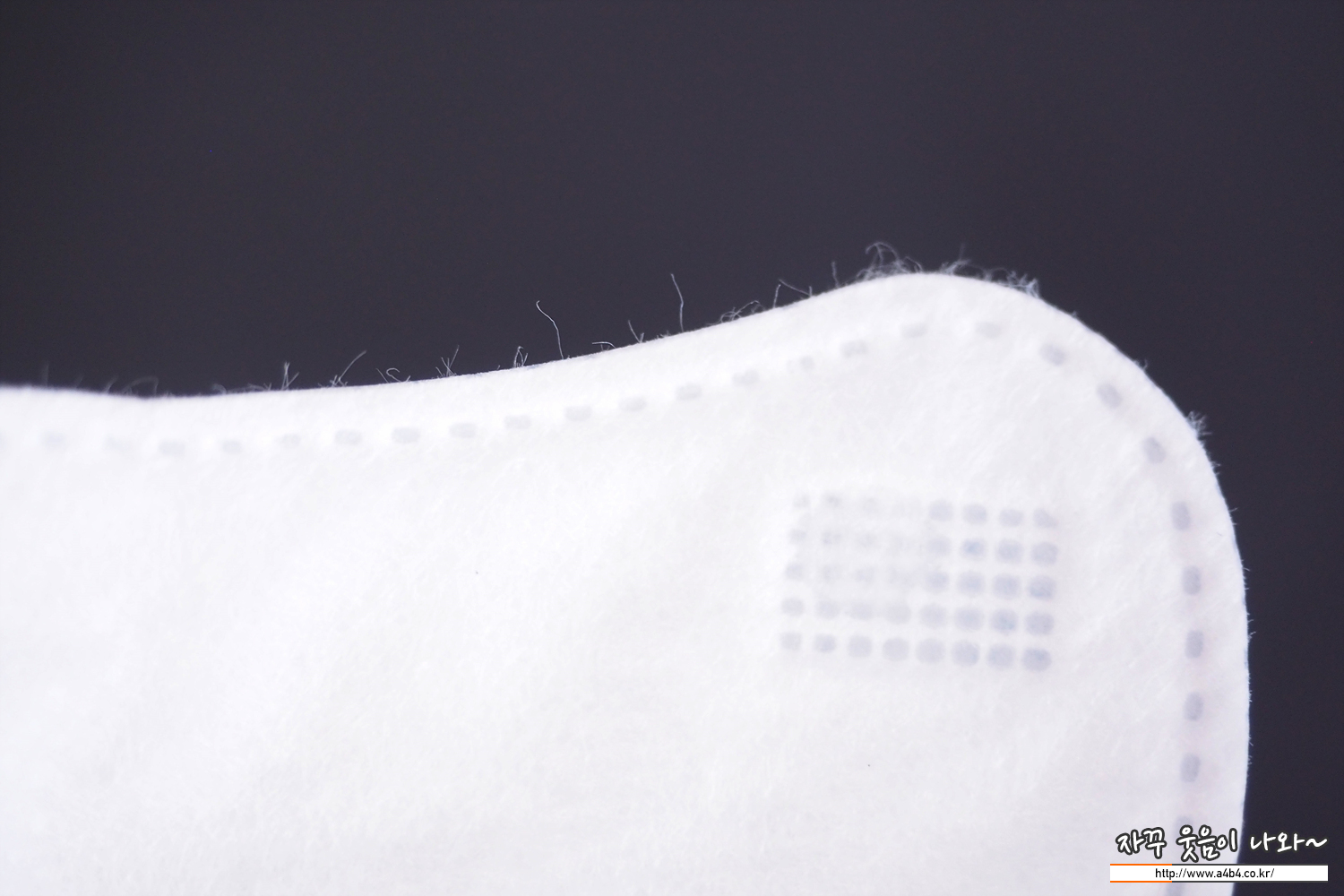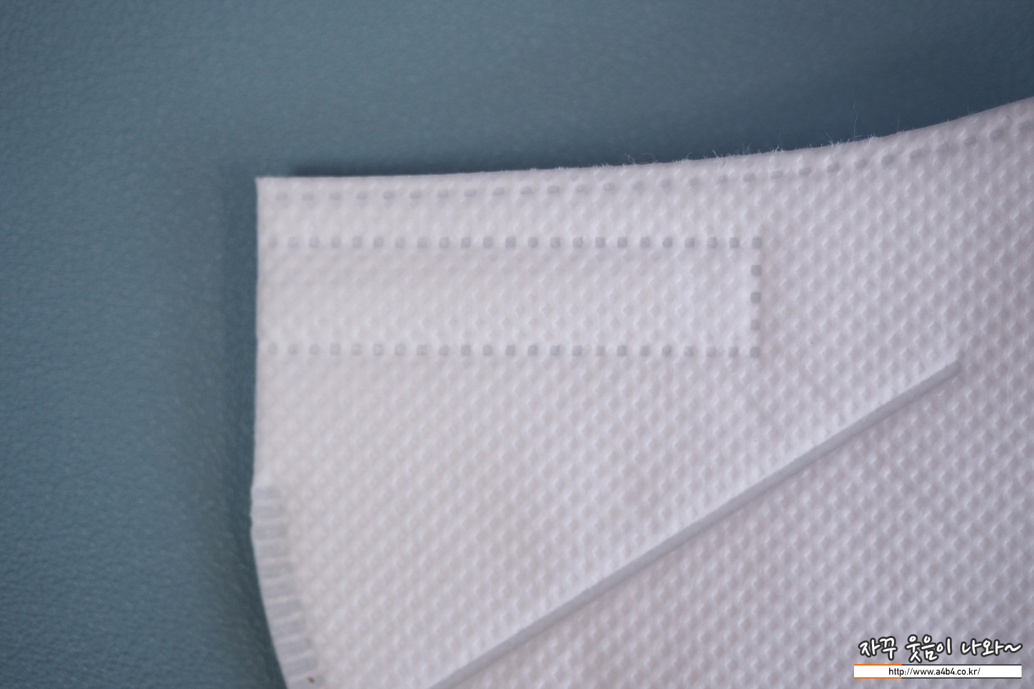 웰클린 마스크 대형 안감은 드라이한 촉감의 부직포가 사용되었습니다. 마스크에서 약품 냄새는 나지 않지만, 안쪽과 테두리로 보풀이 많이 보입니다. 다만 장시간 마스크를 사용해도 볼이나 코 주위가 가렵거나 간지러운 피부 트러블은 없었습니다.