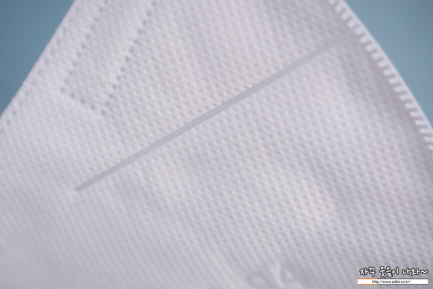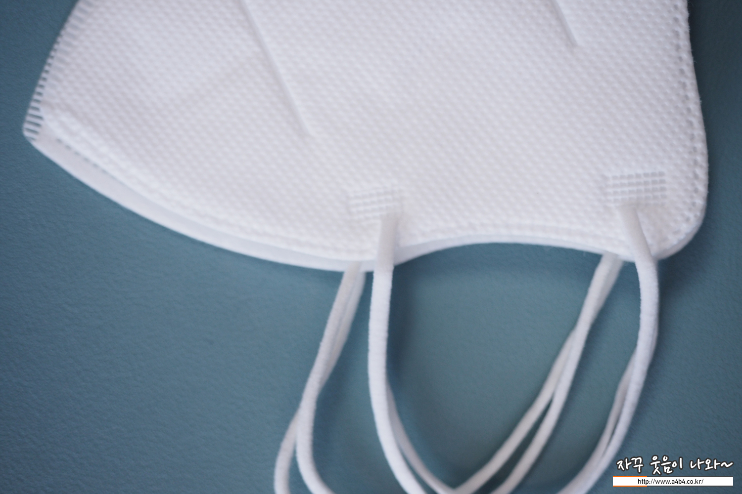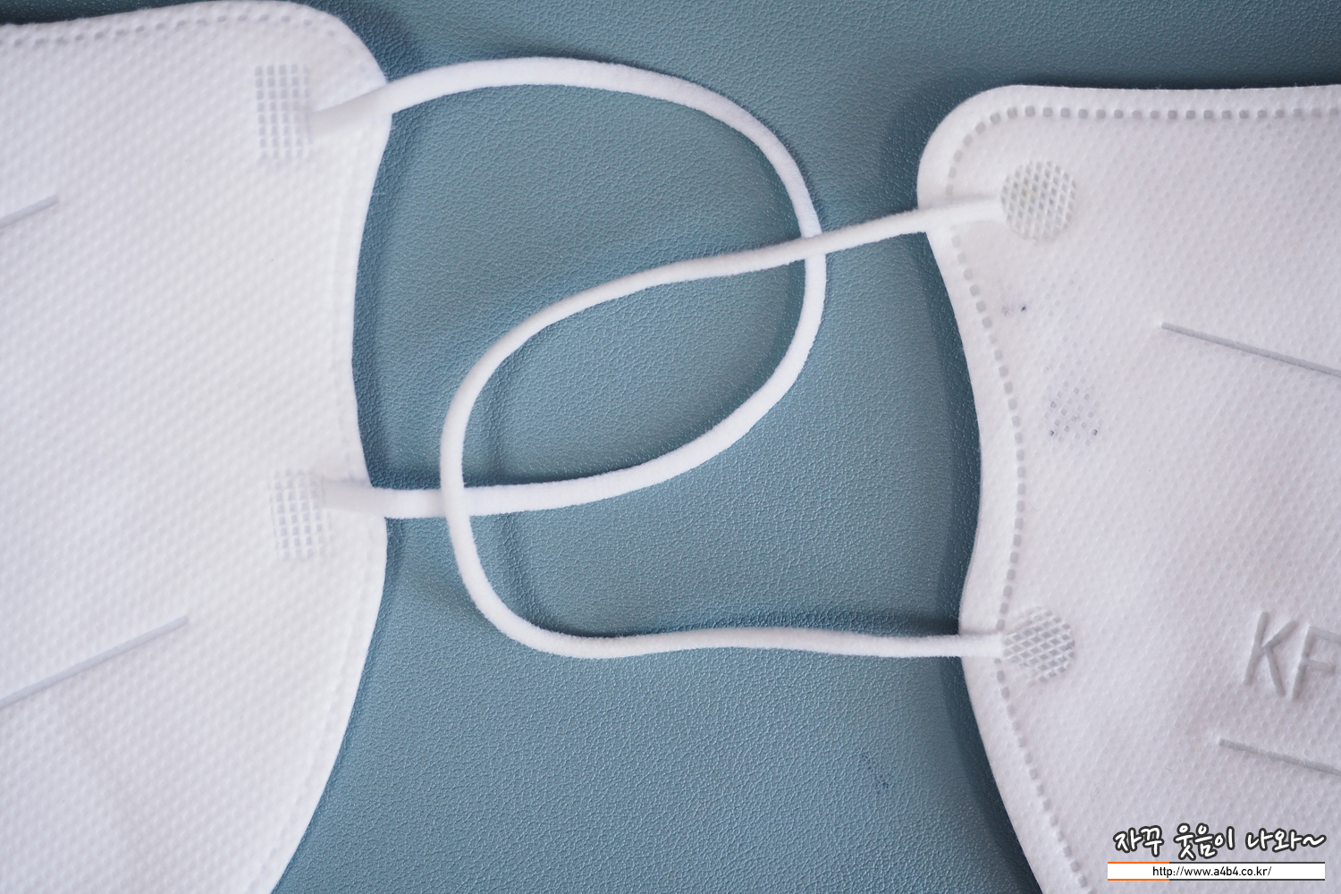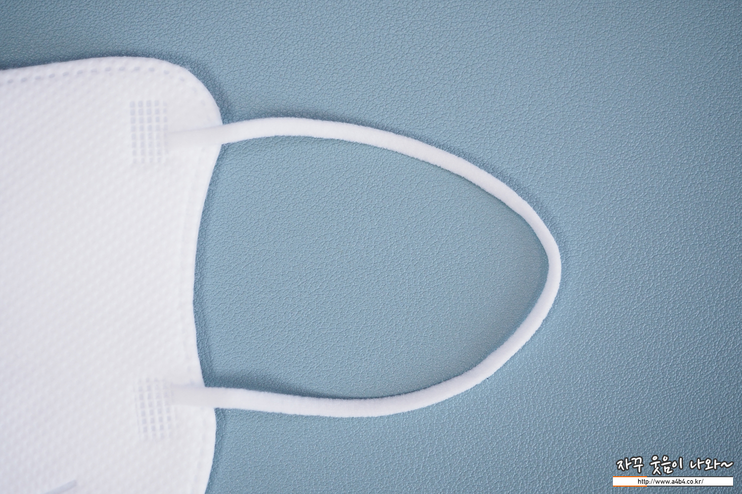 마스크 앞부분에는 납작한 타입의 칼국수타입 어어밴드가 부착되어 있습니다. 부착 상태는 양호하며, 이어밴드 탄력은 일반적인 수준입니다.