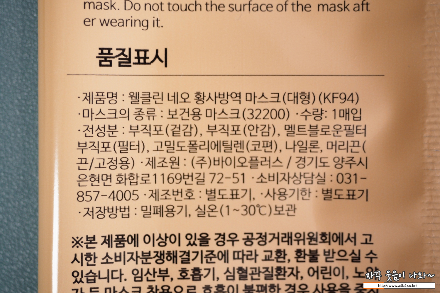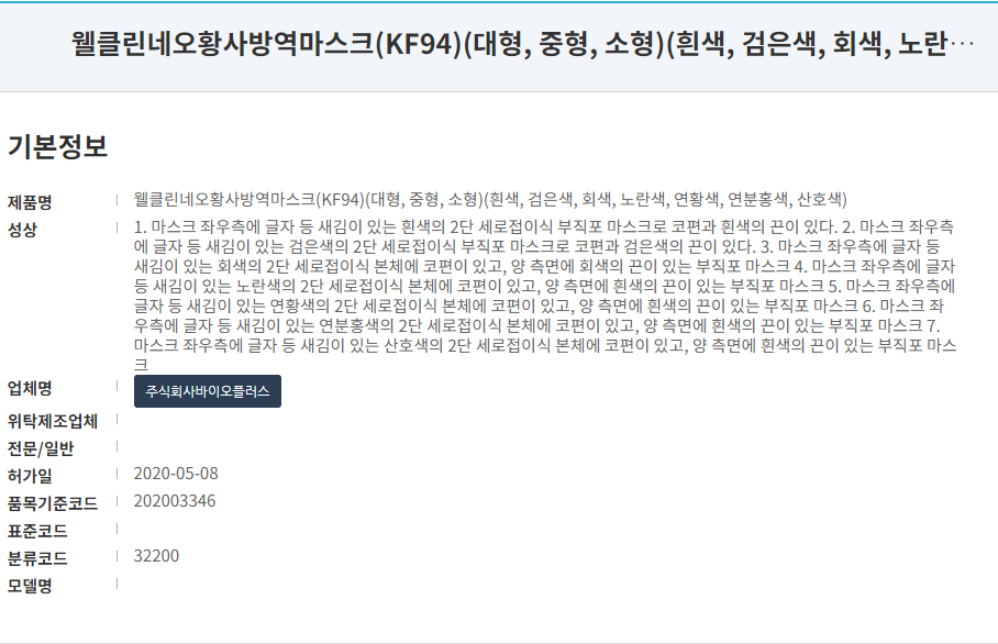 식약처 의약품안전나라 등록 제품명은 '웰클린네오황사방역마스크'입니다. KF94 타입으로 웰클린 마스크 사이즈는 대형, 중형, 소형. 색상은 흰색, 검은색, 회색, 노란색, 연황색, 연분홍색, 산호색이 있습니다. 2020년 05월 08일 허가된 마스크로 마스크 제조사는 주식회사바이오플러스입니다. 이외에도 '웰클린'브랜드로 다양한 마스크를 생산하고 있습니다.