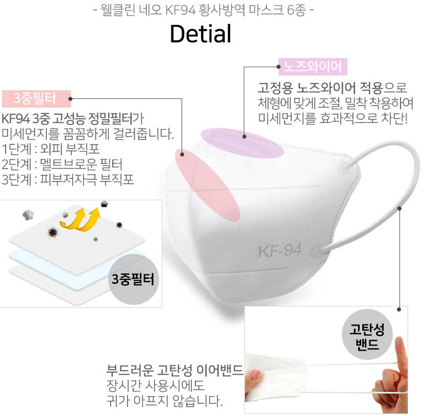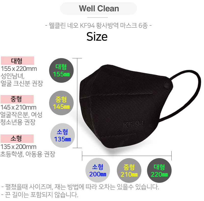 제품명 웰클린네오황사방역마스크(KF94)(대형, 중형, 소형)(흰색, 검은색, 회색, 노란색, 연황색, 연분홍색, 산호색)