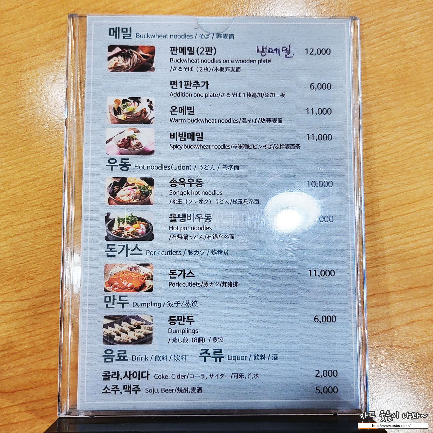 대표메뉴일 판메일과 온메밀, 비빔메밀국수가 있고. 돌냄비 우동 등의 우동과 돈까스가 준비도이 있습니다. 사이드 메뉴로는 만두가 있으며 송옥 메밀과 우동 가격은 1만원 초반입니다.