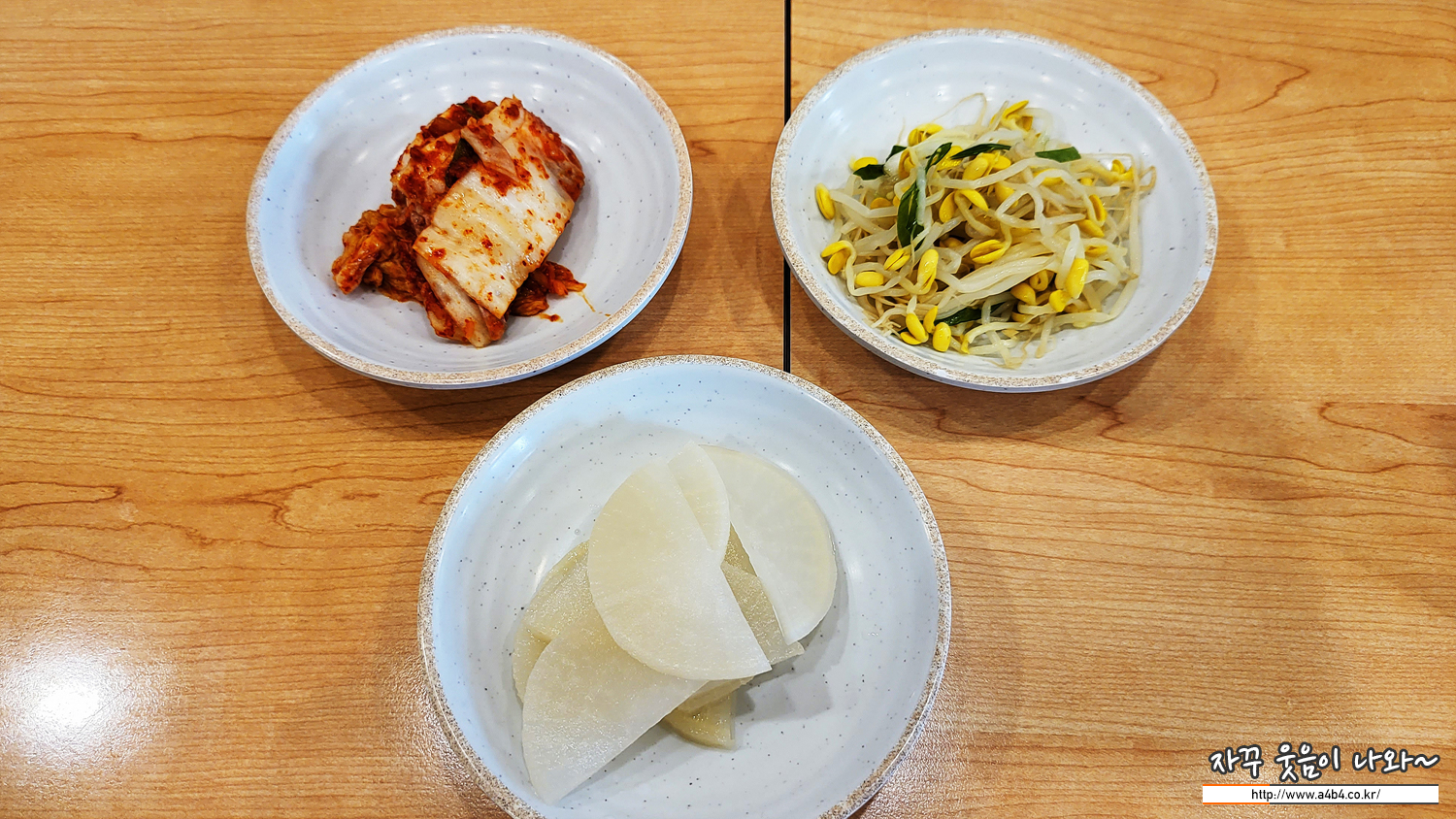 차림반찬은 단무지와 김치, 콩나물무침이 준비되어 있습니다.