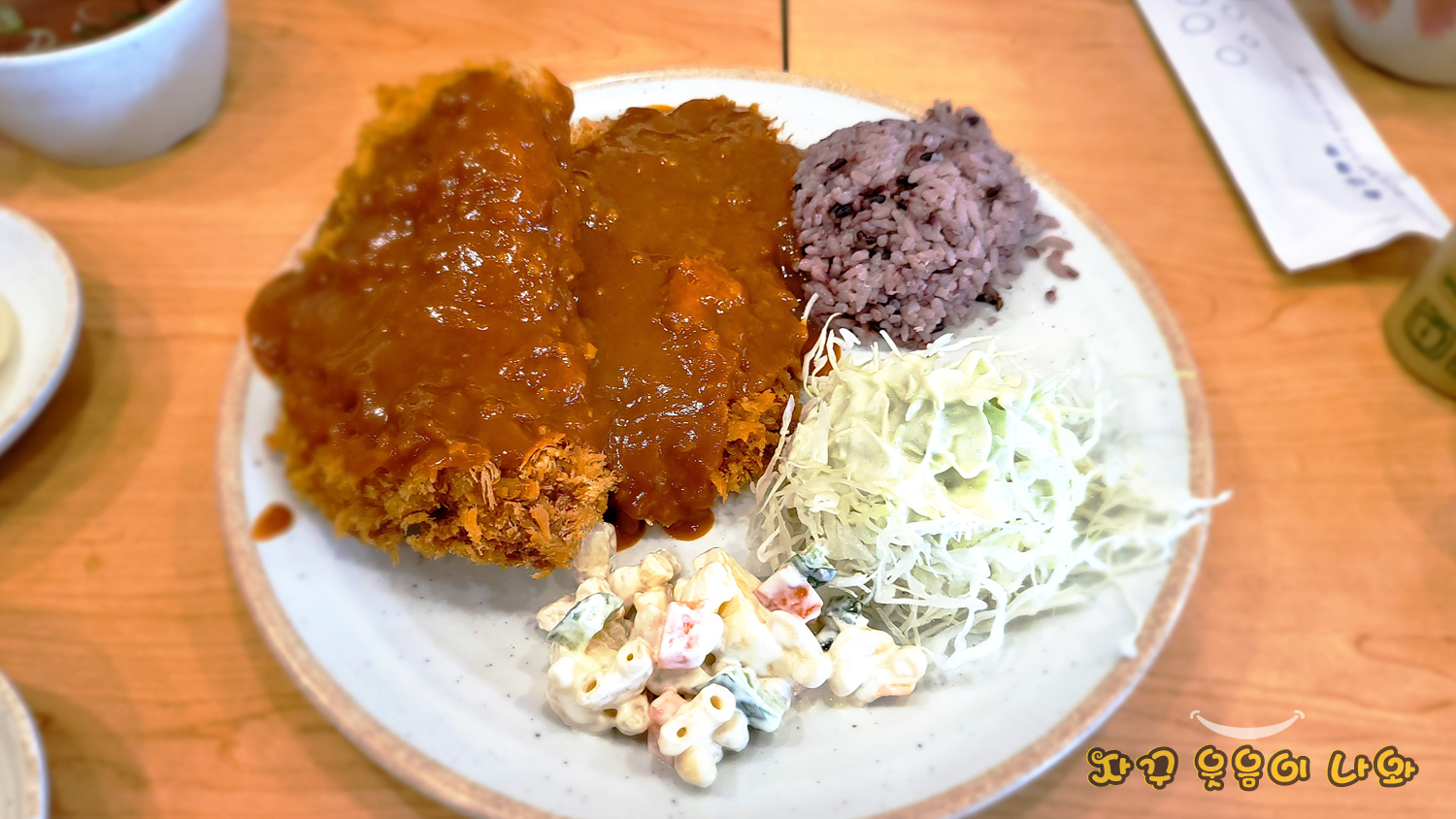 사이드 음식은 마카로나와 양배추 샐러드와 흑미밥, 전형적인 옛날 송옥 돈까스입니다.