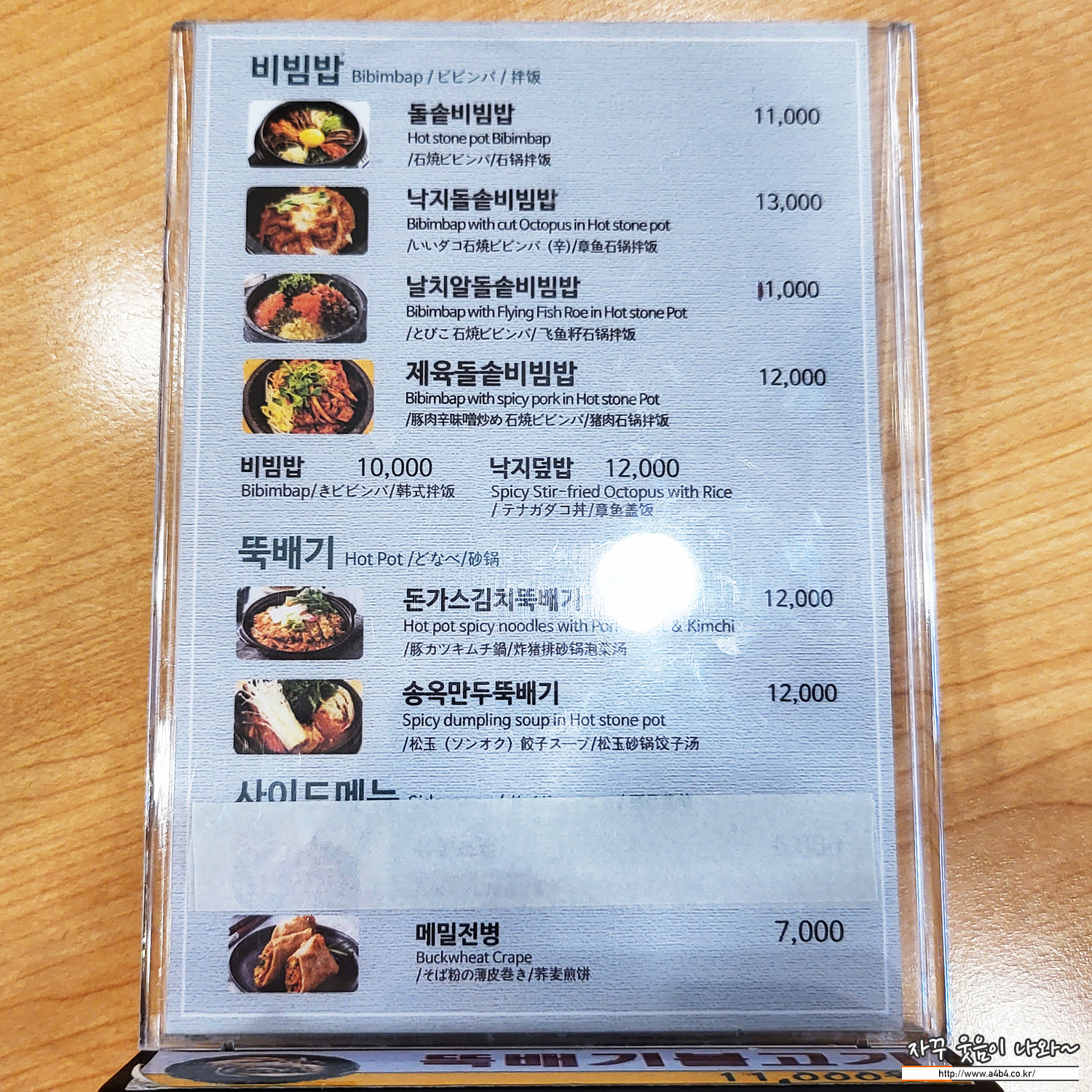 면을 싫어하시는 분들을 위해 비빔밥도 준비되어 있습니다. 돌솥비빔밥, 낙지돌솥, 날치알 돌솥 등 비빔밥과 뚝배기도 만날 수 있습니다. 가격은 역시 1만원 초반가격입니다.