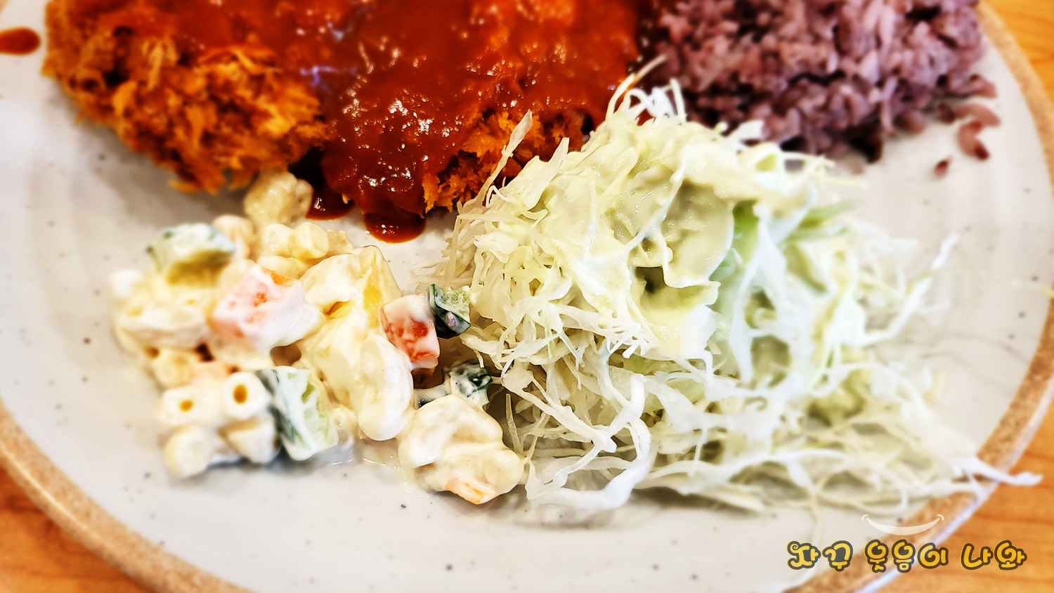 사이드 음식은 마카로나와 양배추 샐러드와 흑미밥, 전형적인 옛날 송옥 돈까스입니다.