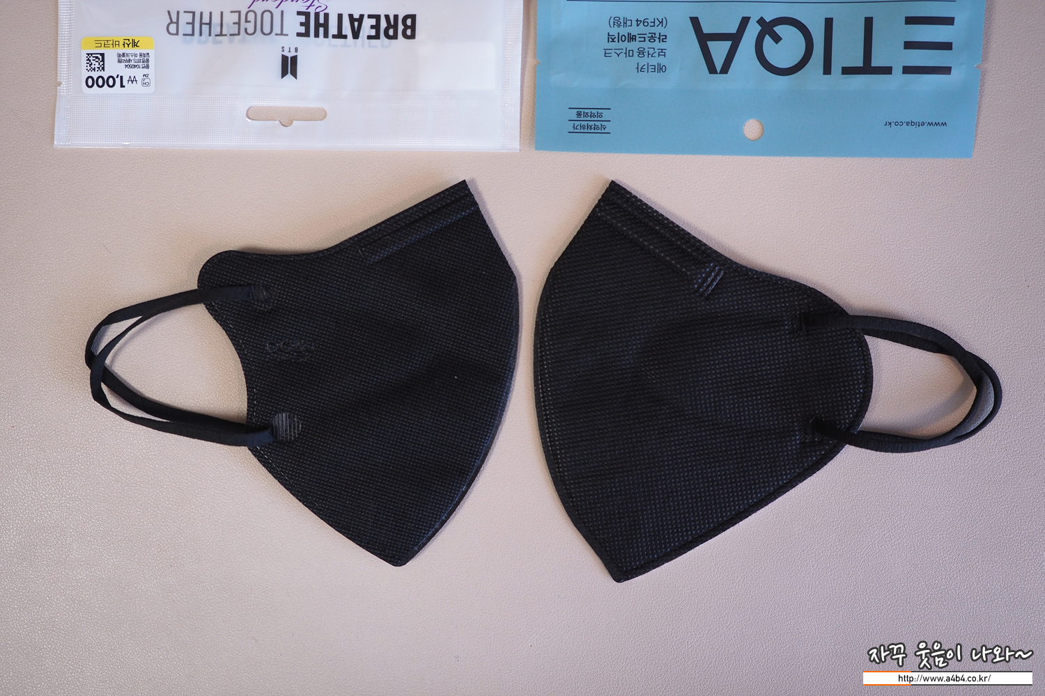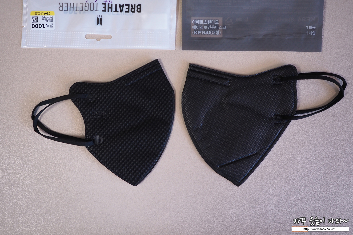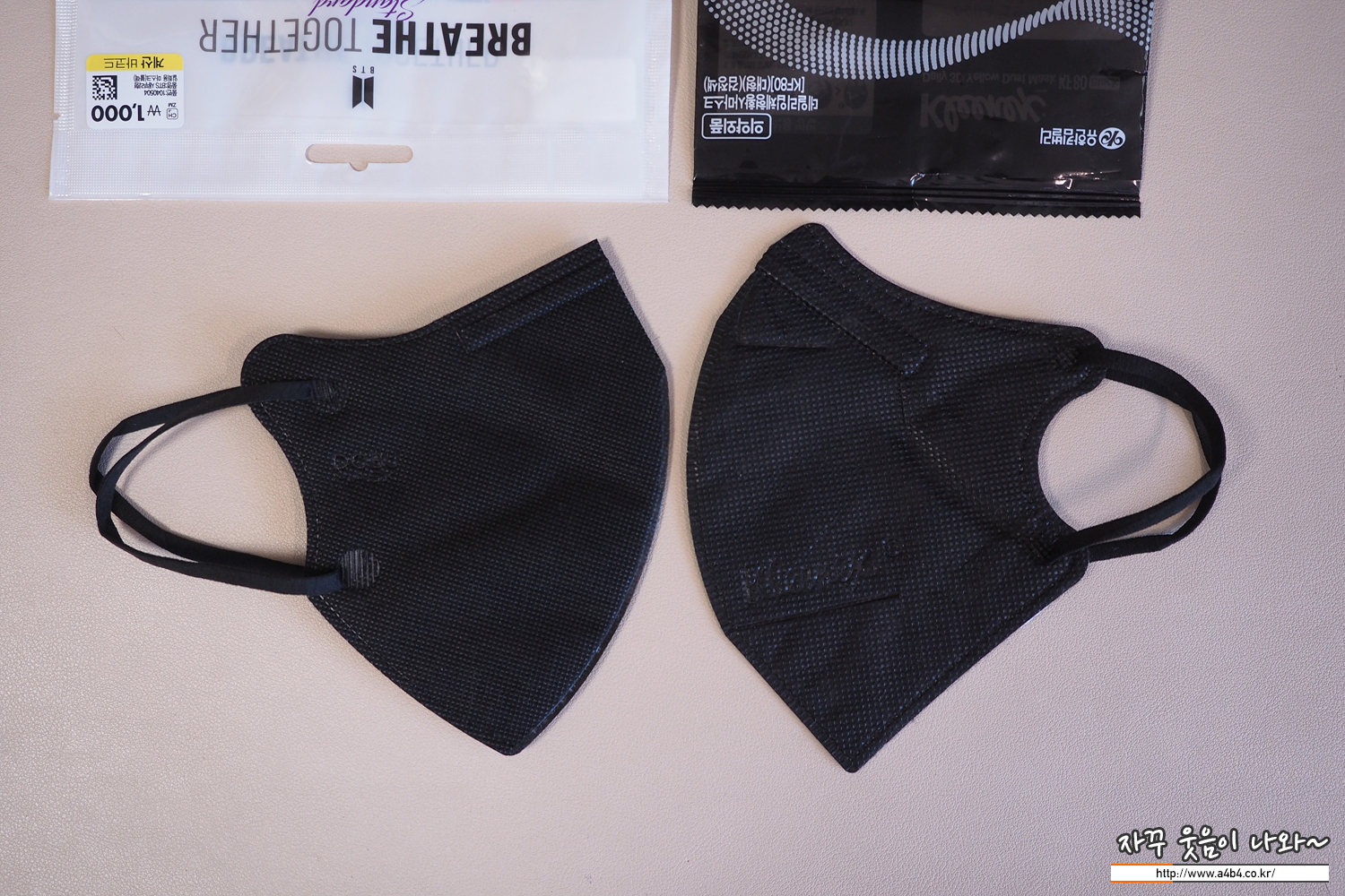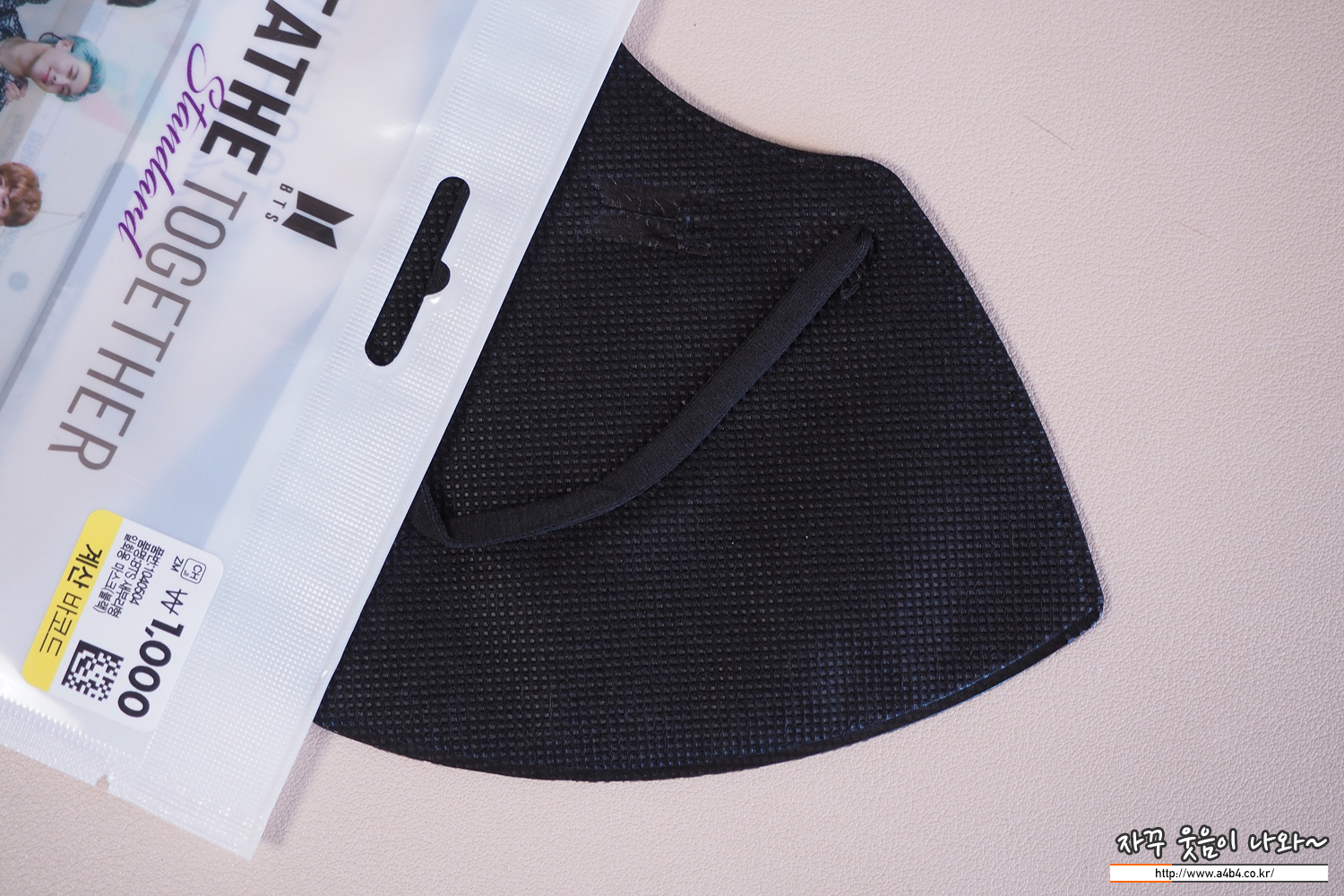 브리드 투게더 스텐다드 마스크는 일반 2D 타입으로 불리는 새부리형 마스크 디자인을 보여줍니다. 마스크 전면 한쪽에는 BTS 심볼이, 다른 한 쪽에는 마스크 이름이 각인되어 있습니다. 역시나 블랙마스크 각인은 깔끔하지 못하네요. (제가 리뷰한 대부분의 검정 컬러마스크 공통적인 문제로 보이네요. 다음에는 다른 컬러 리뷰를...)