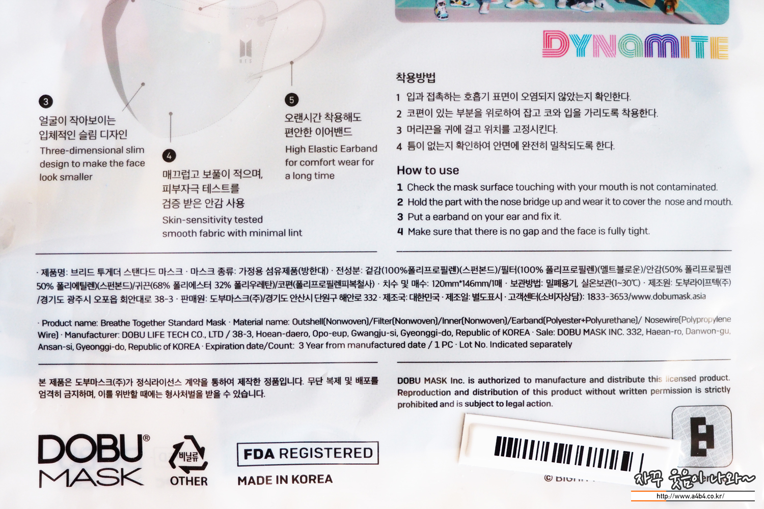 마스크 제품명은 '브리드 투게더 스텐다드 마스크' 입니다. 마스크 제조사는 도부라이프텍, 판매원은 국내 최초 마스크 제조사인 도부마스크로 두 가지 타입의 방탄소년단 마스크를 선보이고 있습니다. 프리미엄 라인과 퍼블릭 라인이 있는데요 오늘은 대표곡인 다이너마이트 컨셉의 퍼블릭라인 제품입니다.