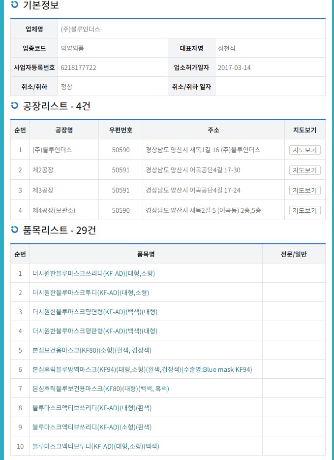 식품의약품안전처 의약품안전나라에 등록된 제품명은 '블루 방역마스크'입니다. KF94 타입의 마스크로 색상은 흰색과 검정색, 마스크 크긴느 대형과 소형이 출시되어 있습니다. 17년에 허가된 마스크로 마스크 제조사는 주식회사 블루인더스입니다.