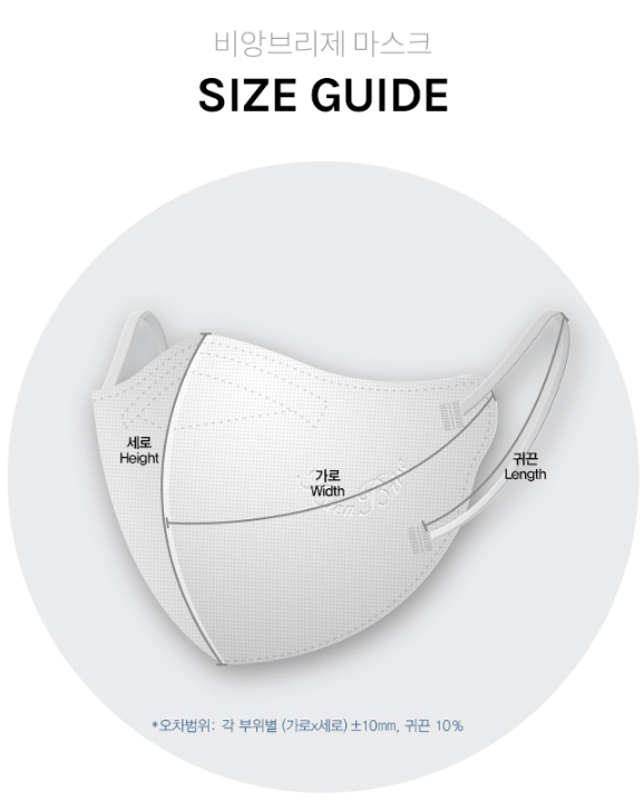 비앙브리제 에어슬림 마스크 대형은 여성용 대형사이즈로 일반 대형사이즈에 비해 약간 작은 사이즈를 보입니다. 사이즈별 크기는 아래 표 참고하세요