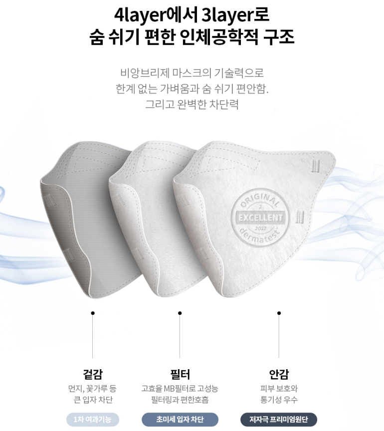 마스크 디자인은 일반적은 새부리타입 마스크로 불리는 이단접이식 투디 마스크 디자인을 보여주고 있습니다. 마스크 전면에는 브랜드명인 '비앙브리제 (Bien Brise}'가 각인되어 있습니다. 참고로 비앙브리제 뜻은 프랑스어로 '행복한, 만족한, 좋은'이라는 Bien과 '산들바람, 미풍'이라는 뜻의 Brise의 합성어라고 합니다.