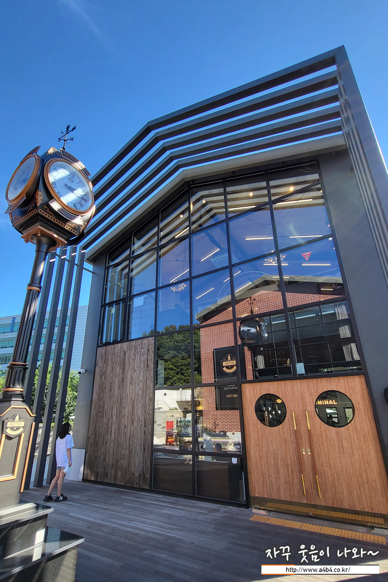 야탑 베이커리카페 맛집인 bd788은 시계탑을 기준으로 두 개의 건물이 위치해 있습니다. 건물 왼쪽은 화장실과 단체룸이 오른쪽에는 일반 방문객이 이용할 수 있는 2층 카페가 있습니다.