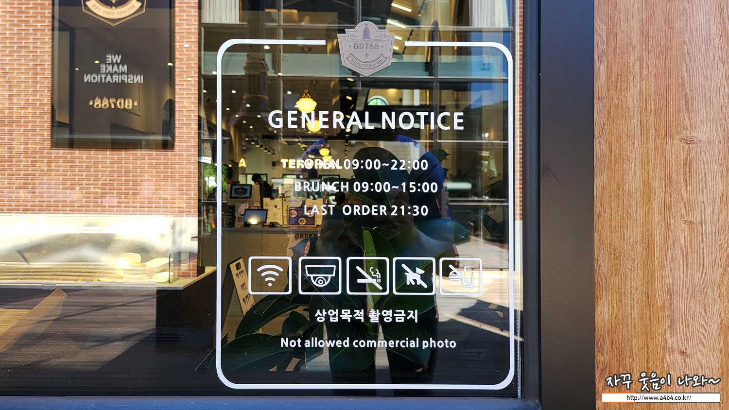 영업시간은 09:00 ~ 22:00 까지로 라스트 오더는 영업종료 30분 전인 21시 30분입니다. 브런치는 오후 3시까지 주문이 가능합니다. BD788 휴무일은 별도 안내가 없는데. 별도 확인은 못했네요.
