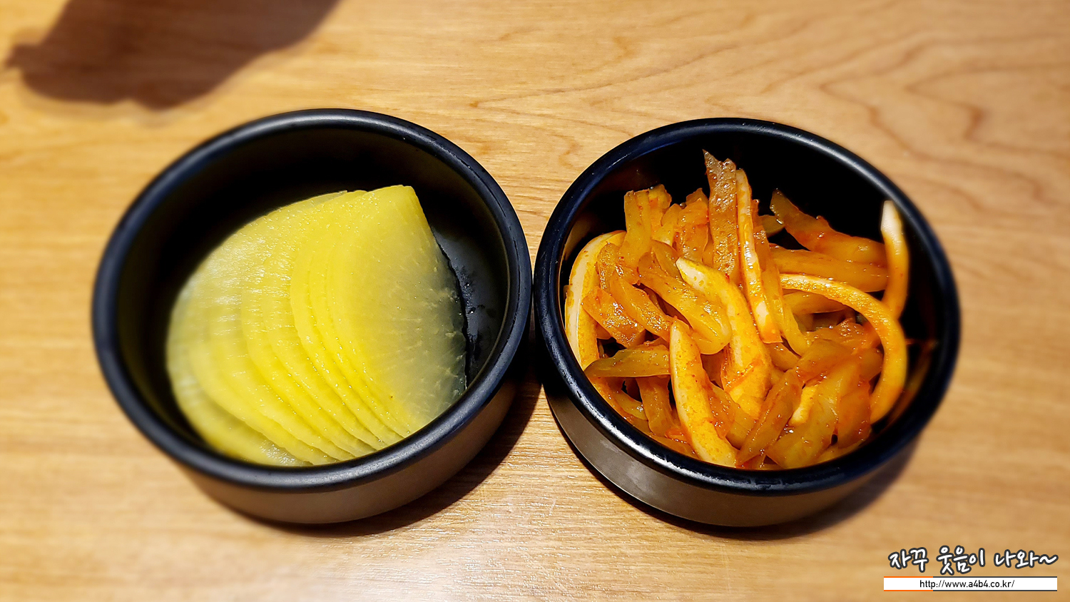 기본 반찬은 단무지와 짜사이가 제공됩니다.
