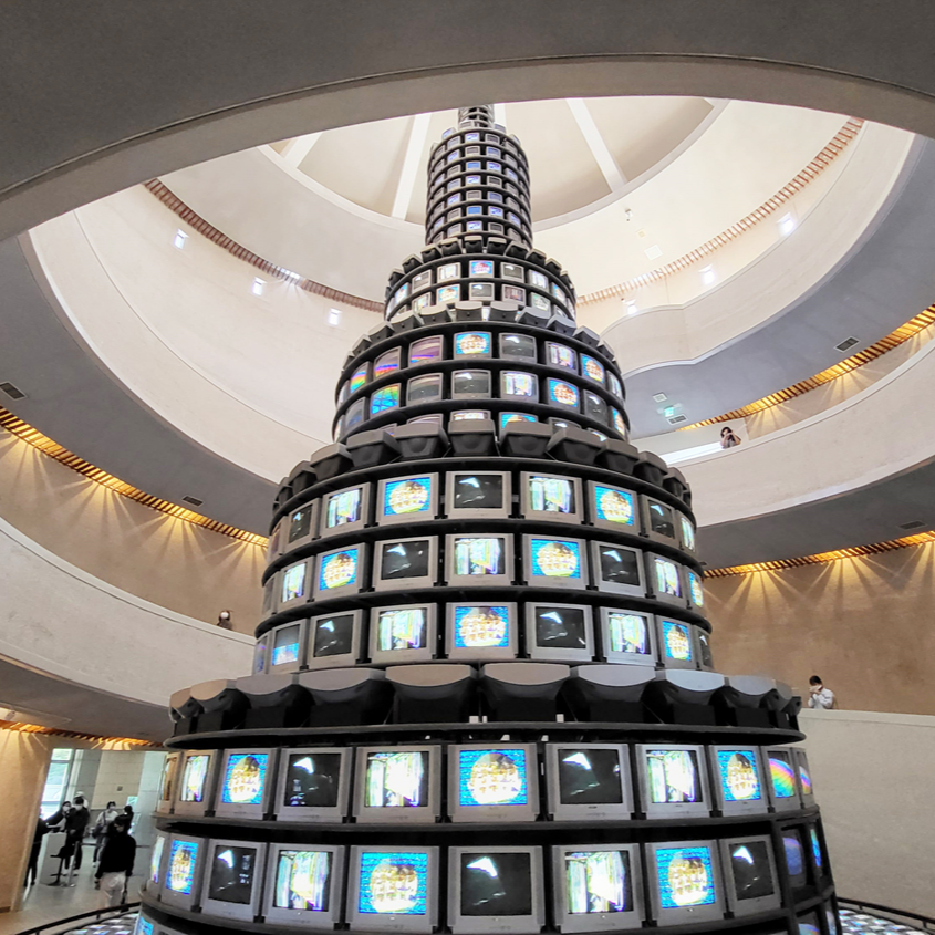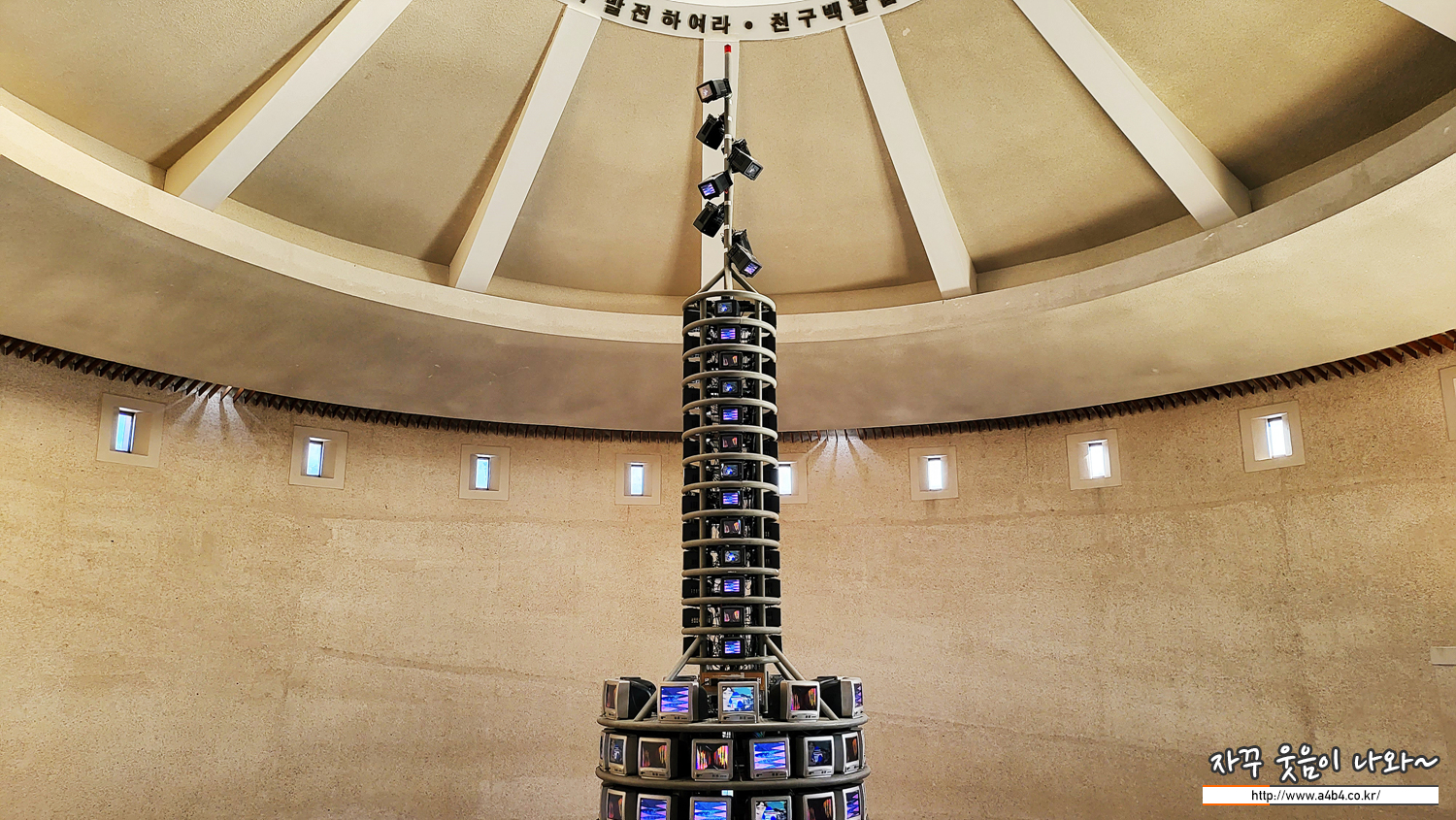 다다익선은 86, 88년 서울 아세안게임과 올림픽을 기념해 제작된 작품으로 개천절을 상징하는 1,003개의 CRT 모니터로 제작된 그의 가장 큰 작품으로 사이즈는 지름 7.5미터, 높이 18.5미터의 규모를 보입니다.