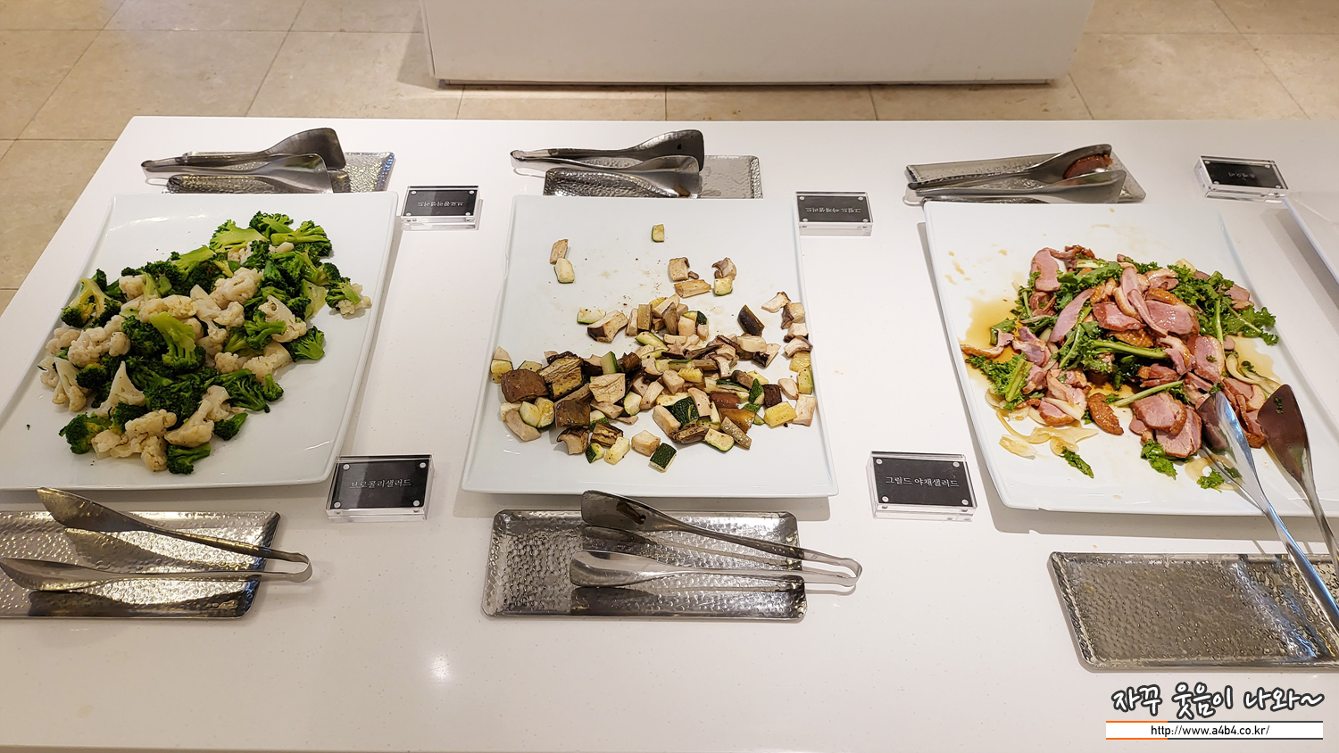 브로콜리샐러드, 그릴드 아채샐러드 및 기본적인 샐러드와 드레싱이 준비되어 있습니다.