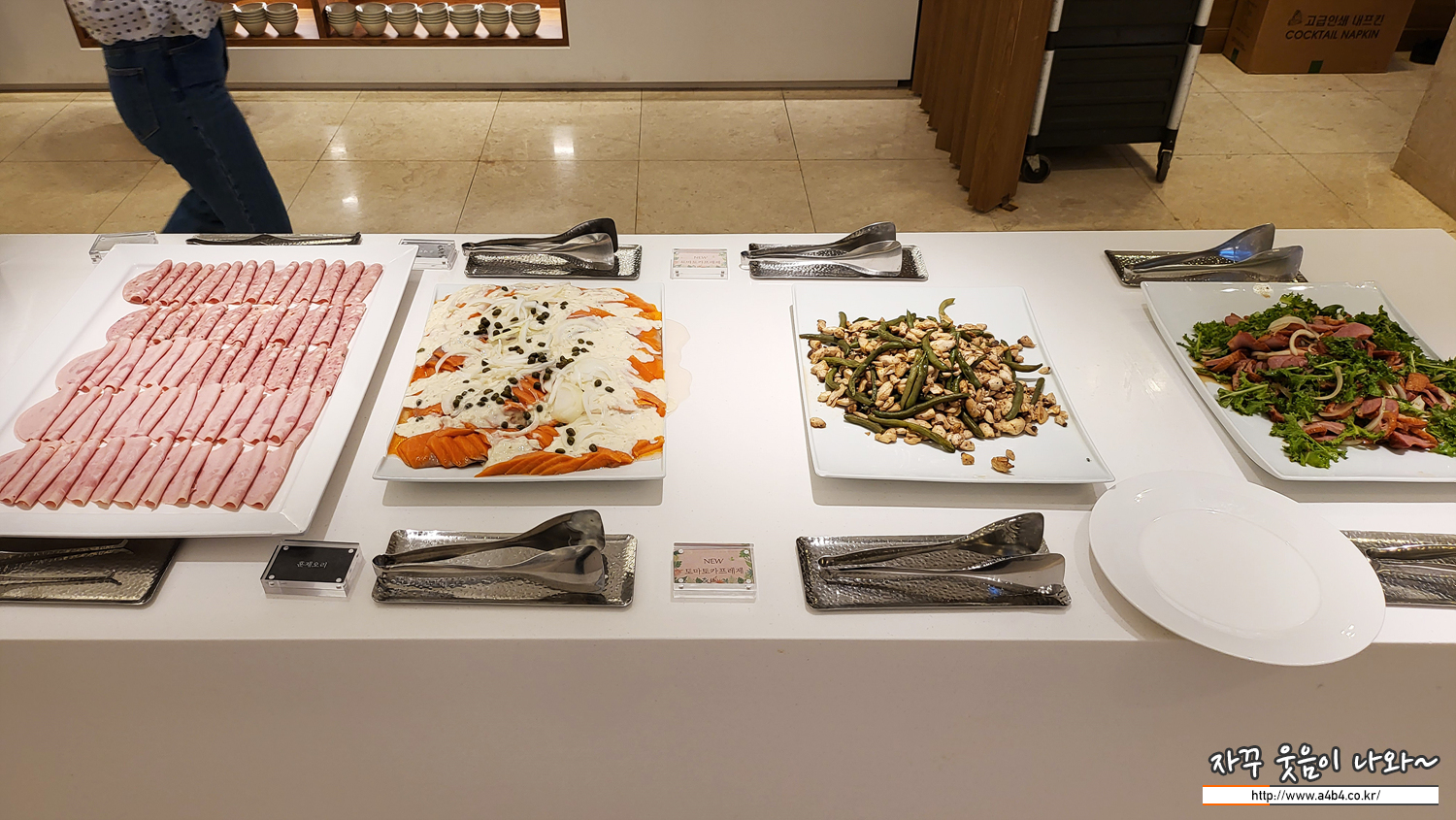 햄과 연어샐러드, 견과류, 오리훈제가 나오네요.