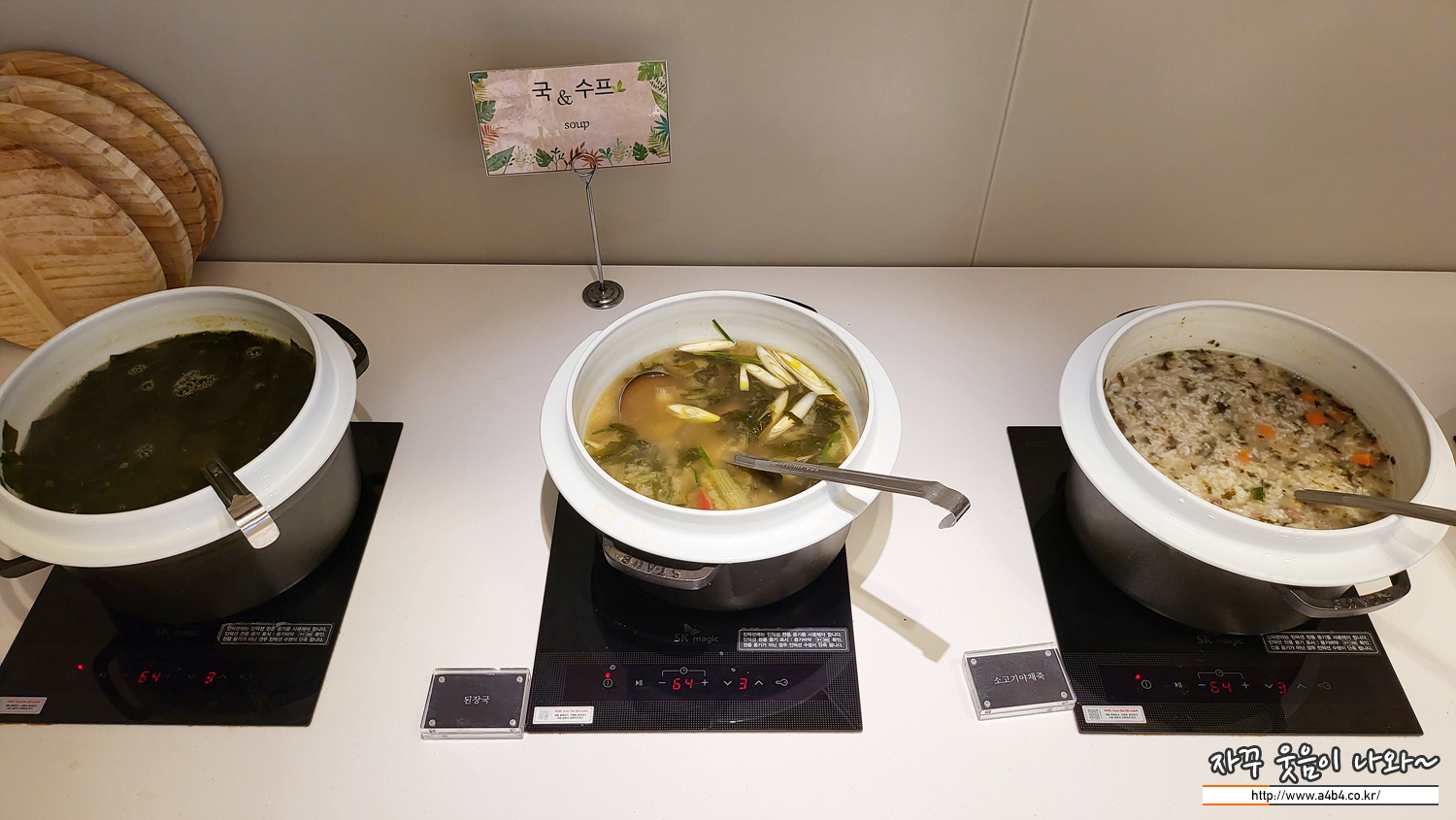 국과 스프는 미역국과 된장국 그리고 소고기 야채죽이 준비되어 있습니다.