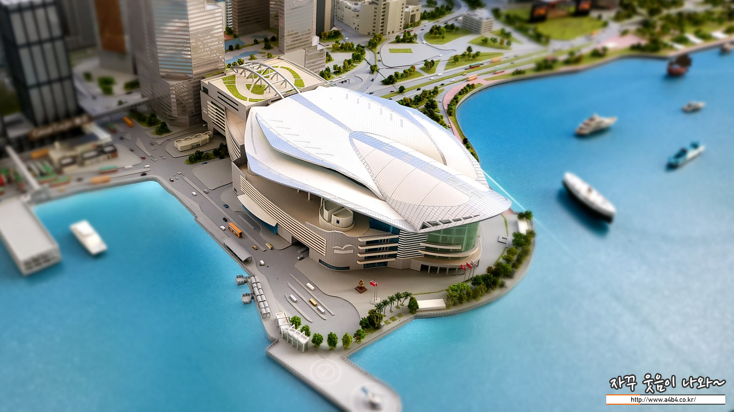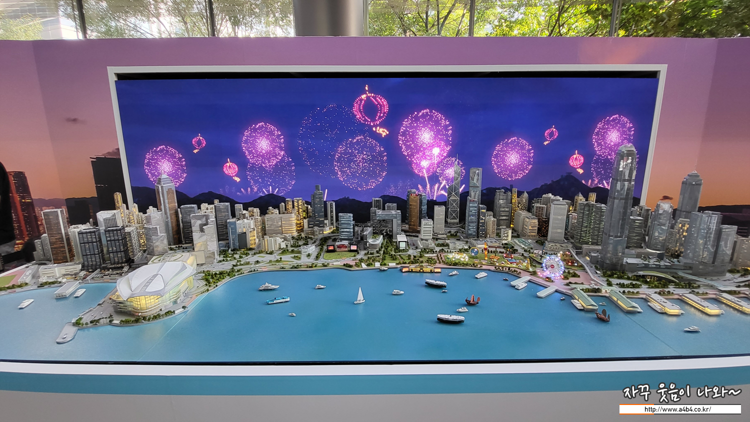 홍콩 빅토리아 하버 미니어처 뒤로 영상통한 연출과 바닷가의 배도 이동한다는...